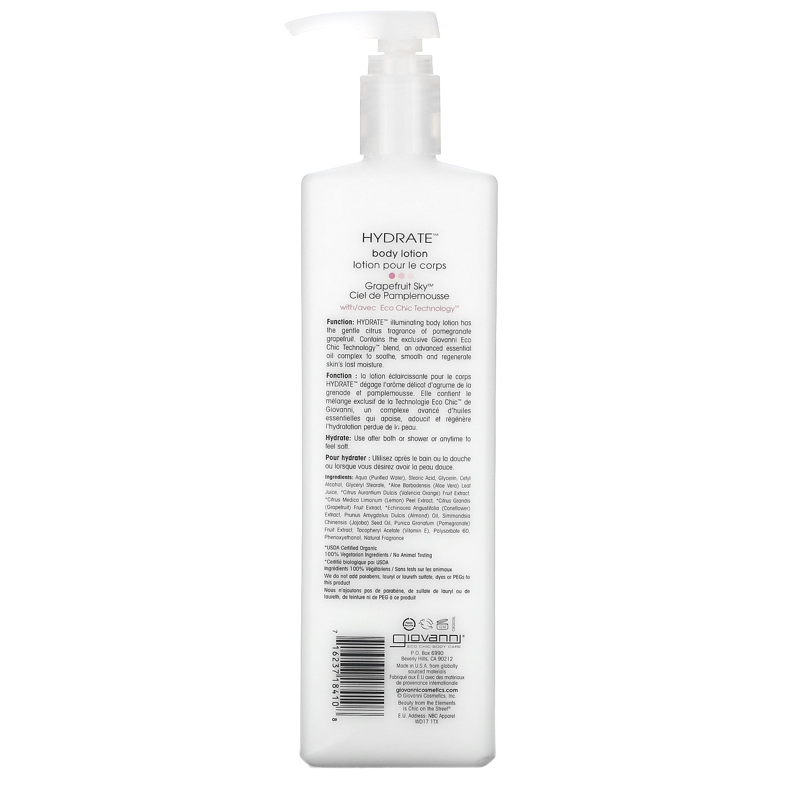 Eco Chic Body Care With Eco Chic Technology ™ 100% Vegetarian Ingredients No Animal Testing Leaping Bunny Certified Function: HYDRATE ™ Illuminating body lotion has the gentle citrus fragrance of pomegranate grapefruit. Contains the exclusive Giovanni Eco Chic Technology ™ blend, an advanced essential oil complex to soothe, smooth and regenerate skin's lost moisture.Sugg. UseUse after bath or shower or anytime to feel soft.Other IngredientsAqua (purified water), stearic acid, glycerin, cetyl alcohol, glyceryl stearate, *aloe barbadensis (aloe vera) leaf juice, *citrus aurantium dulcis (valencia orange) fruit extract, *citrus medica limonum (lemon) peel extract, *citrus grandis (grapefruit) fruit extract, *echinacea angustifolia (coneflower) extract, prunus amygdalus dulcis (almond) oil, simmondsia chinensis (jojoba) seed oil, tocopheryl acetate (vitamin E), polysorbate 60, phenoxyethanol, natural fragrance. *USDA certified organic We do not add parabens, lauryl or laureth sulfate, dyes or pegs tp this product.Supplement FactsDisclaimerWhile VitaminsUK strives to ensure the accuracy of its product images...