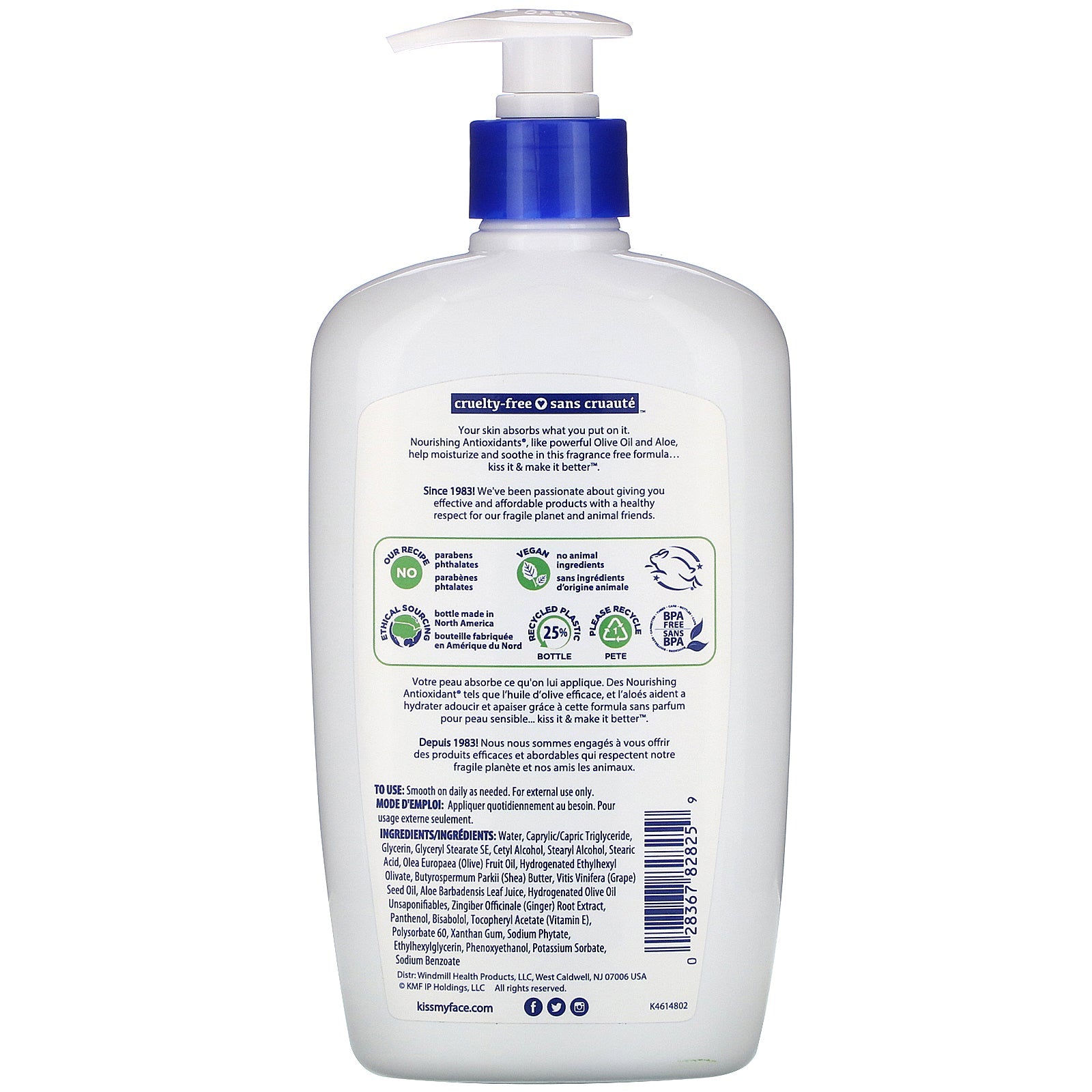 Deep Moisture for Dry Skin With Nourishing Antioxidants™ Vegan - Cruelty Free Our Recipe No - Parabens - Phthalates No Animal Ingredients Ethical Sourcing BPA Free Your skin absorbs what you put on it. Nourishing Antioxidants®, like powerful Olive Oil and Aloe help moisturize and soothe in this fragrance free formula...kiss it & make it better™. Since 1983! We've been passionate about giving you effective and affordable products with a healthy respect for our fragile plant and animal friends.Sugg. UseSmooth on daily as needed.Other IngredientsWater, caprylic/capric triglyceride, glycerin, glyceryl stearate se, cetyl alcohol, stearyl alcohol, stearic acid, olea europaea (olive) fruit oil, hydrogenated ethylhexyl olivate, butyrospermum parkii (shea) butter, vitis vinifera (grape) seed oil, aloe barbadensis leaf juice, hydrogenated olive oil unsaponifiables, zingiber officinale (ginger) root extract, panthenol, bisabolol, tocopheryl acetate (vitamin E), polysorbate 60, xanthan gum, sodium phytate, ethylhexylglycerin, phenoxyethanol, potassium sorbate, sodium benzoate.Supplement FactsDisclaimerWhile VitaminsUK strives to ensure...