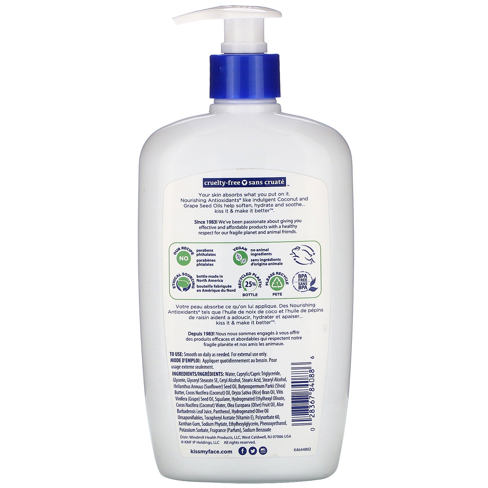 Deep Moisture for Dry Skin With Nourishing Antioxidants™ Vegan - Cruelty Free Our Recipe No - Parabens - Phthalates No Animal Ingredients Ethical Sourcing BPA Free Your skin absorbs what you put on it. Nourishing Antioxidants® like indulgent Coconut and Grape Seed Oils help soften, hydrate and soothe... kiss it make it better™. Since 1983, We've been passionate about giving you effective and affordable products with a health respect for our fragile planet and animal friends.Sugg. UseSmooth on daily as needed.Other IngredientsWater, caprylic/capric triglyceride, glycerin, glyceryl stearate se, cetyl alcohol, stearic acid, stearyl alcohol, helianthus annuus (sunflower) seed oil, butyrospermum parkii (shea) butter, cocos nucifera (coconut) oil, oryza sativa (rice) bran oil, vitis vinifera (grape) seed oil, squalane, hydrogenated ethylhexyl olivate, cocos nucifera (coconut) water, olea europaea (olive) fruit oil, aloe barbadensis leaf juice, panthenol, hydrogenated olive oil unsaponifiables, tocopheryl acetate (vitamin E), polysorbate 60, xanthan gum, sodium phytate, ethylhexylglycerin,...