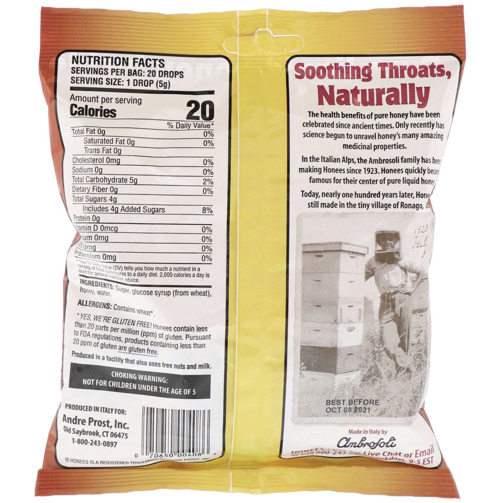 Pure Liquid Honey Inside Absolutely Nothing Artificial Honey Soothes Throat Naturally No Menthol No Artificial Colors or Flavors 20 King Sized, Honey Filled Drops that Soothe Twice as Long! Non GMO Gluten Free* *See ingredient panel The health benefit of
