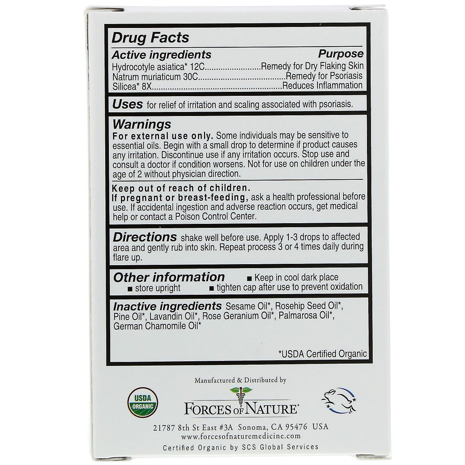 Powerful Medicine Prescribed by Nature Guaranteed Results USDA Certified Organic Homeopathic Certified Organic Medicine Matricaria Chamomilla Fast-Drying, Clear Medicine Naturally Occurring Herbal Scent Concentrated Treatment Pesticide Free Toxin Free GMO Free Vegan Gluten Free Cruelty Free - Leaping Bunny Certified Certified Organic by SCS Global Services Topical Psoriasis Medicine Treats and Heals Dry Flaky Skin and Irritation Associated with Psoriasis Promotes Healthy New Tissue and Helps Prevent Flare-Ups Works with the Body's Natural Immunity Rare Essential Oils by Elite Growers from Across the Planet The Power of Blue Chamomile Our chamomile comes direct from the source from a small organic farm high in the Himalayan Mountains. It is one of a kind. With its high concentration of azulene, it is an excellent anti inflammatory agent used to treat dry, flaky, scaly, irritated skin associated with psoriasis. Psoriasis Relief This is the first ever medicated psoriasis treatment that is certified organic and FDA registered. This revolutionary treatment delivers a long lasting, deep healing effect against psoriasis and works time after time. It is to be applied directly to psoriasis with positive results often experienced in days. Powerful Medicine Prescribed by Nature Forces of Nature proudly provides powerful organic medicines which deliver results time after time. Our organic medicinal plant extracts are sourced from elite growers from all over the planet. This includes high in the Himalayan, Andes, and Rocky Mountains; Madagascar; the islands of Java and Corsica; and pristine locations in California. We provide the ultimate in purity and therapeutic value for our treatments and customers. These are the world's first line of USDA organic medicines and proudly made in the USA. All our ingredients are organic, sustainably grown, and Fair Trade. We insist on the highest quality standards and believe in the power of our treatments. We think you will too. Satisfaction guarantee. Uses: For relief of irritation and scaling associated with psoriasis.