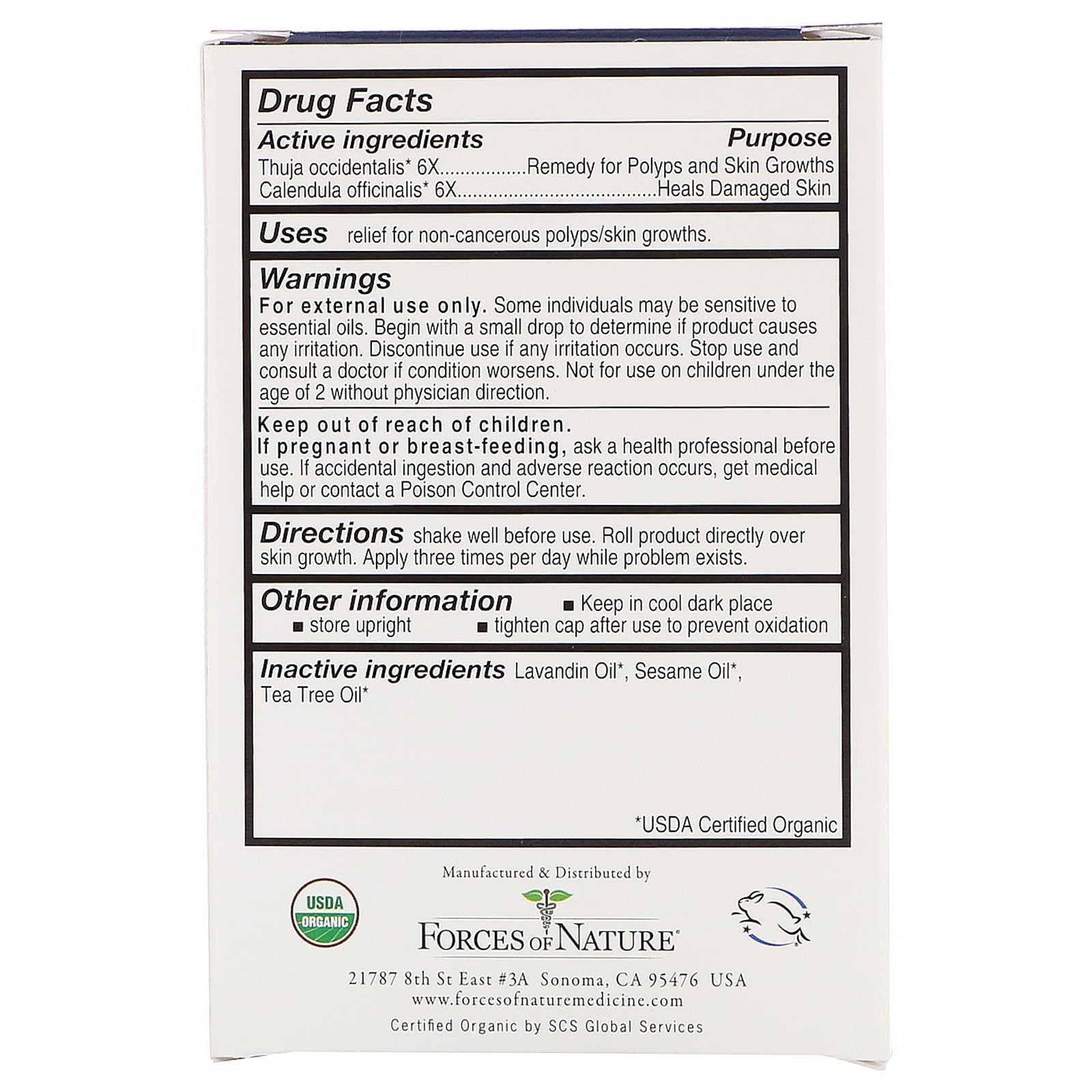 Drug Facts Active ingredients Purpose Thuja occidentalis* 6X Remedy for Polyps and Skin Growths Calendula officinalis* 6X Heals Damaged Skin Inactive ingredients Lavandin oil*, sesame oil*, tea tree oil* *USDA Certified OrganicSupplement Facts