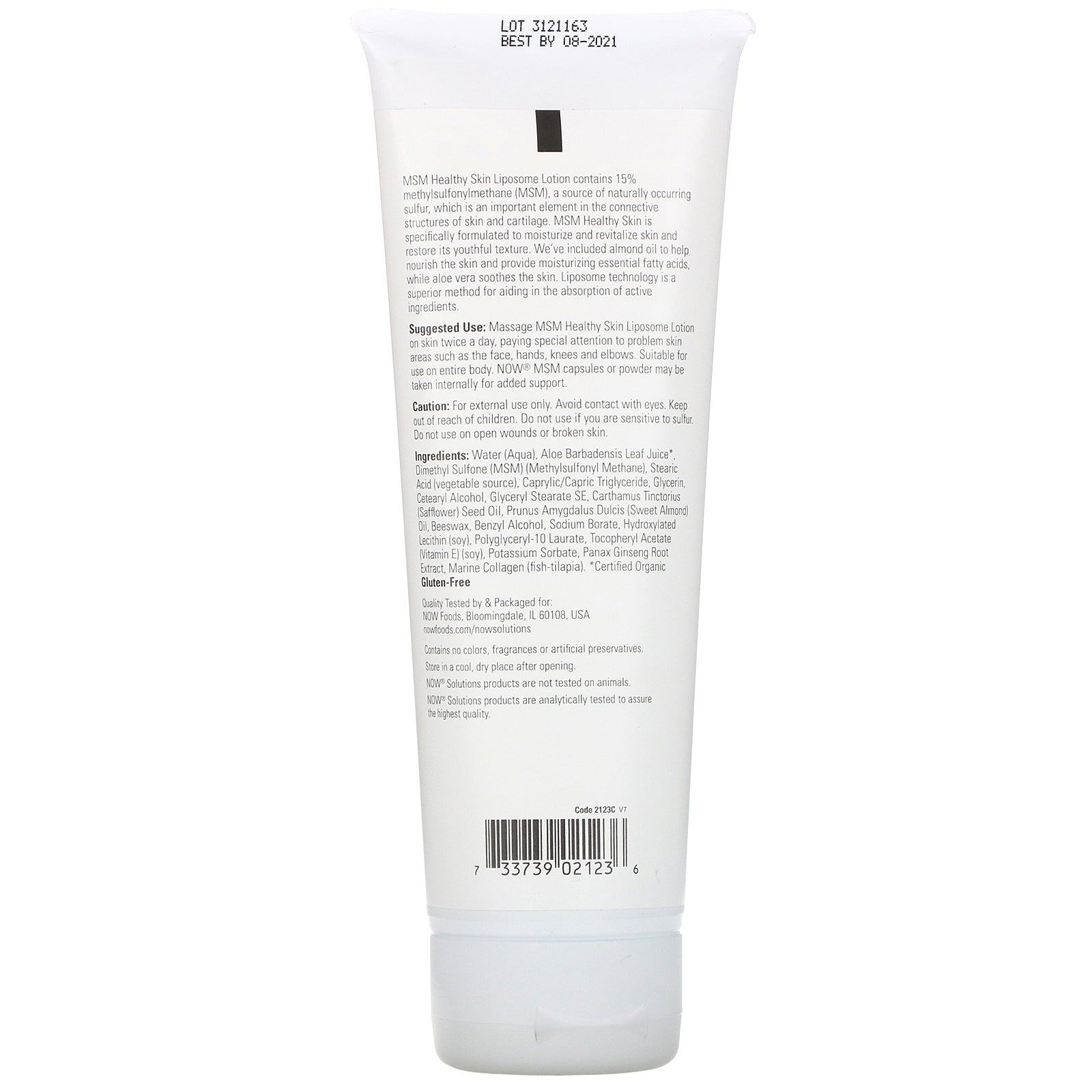 Rejuvenating Cream Promotes Healthy Skin Maintains Youthful Skin Texture Paraben Free Gluten-Free MSM Healthy Skin Liposome Lotion contains 15% methylsulfonylmethane (MSM), a source of naturally occurring sulfur, which is an important element in the connective structures of skin and cartilage. MSM Healthy Skin is specifically formulated to moisturize and revitalize skin and restore its youthful texture. We've included almond oil to help nourish the skin and provide moisturizing essential fatty acids, while aloe vera soothes the skin. Liposome technology is a superior method for aiding in the absorption of active ingredients. NOW® Solutions products are not tested on animals. NOW® Solutions products are analytically tested to assure the highest quality.Sugg. UseMassage MSM Healthy Skin Liposome Lotion on skin twice a day, paying special attention to problem skin areas such as the face, hands, knees and elbows. Suitable for use on entire body. NOW® MSM capsules or powder may be taken...