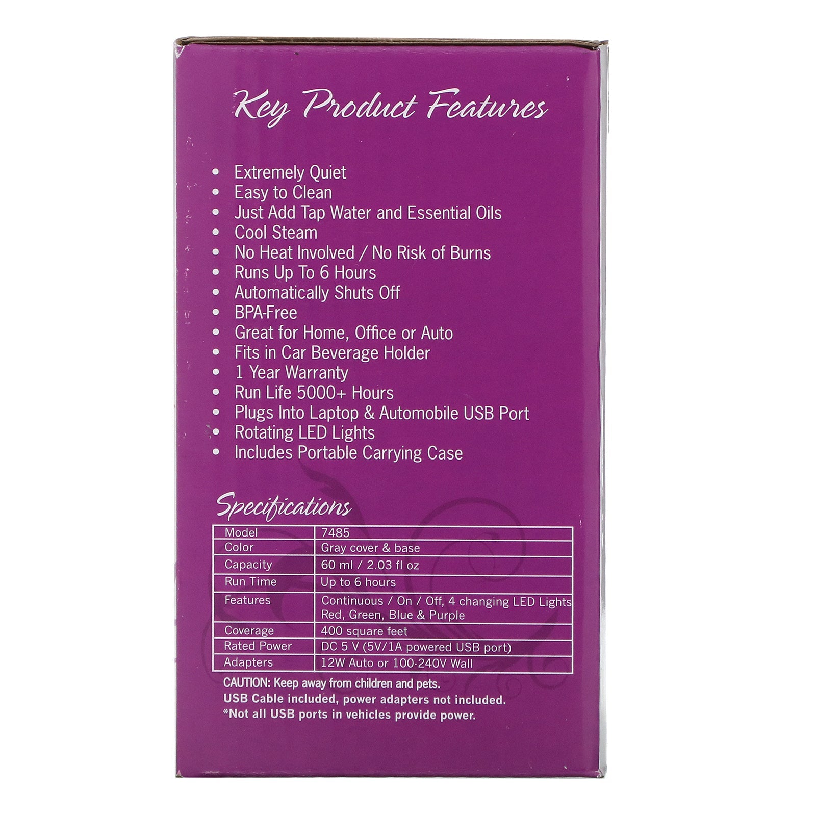Key Product Features Extremely Quiet Easy to Clean Just Add Tap Water and Essential Oils Cool Steam No Heat Involved / No Risk of Burns Automatically Shuts Off BPA-Free Great for Home, Office or Auto Fits in Car Beverage Holder 1 Year Warranty Runs Life 5