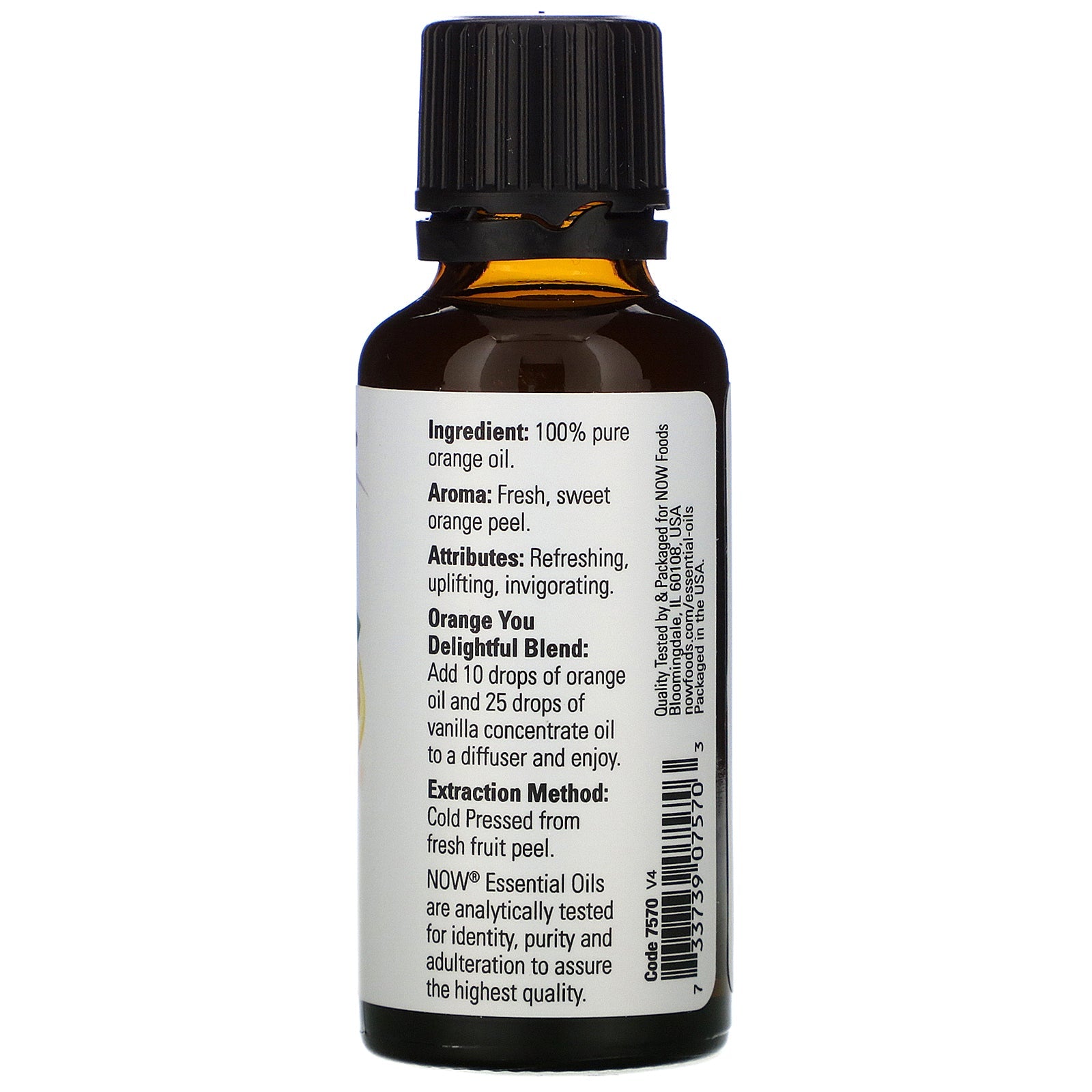 100% Pure Citrus Sinensis Purity Tested/Quality Assured Aroma: Fresh, sweet orange peel. Attributes: Refreshing, uplifting, invigorating Extraction Method: Cold pressed from fresh fruit peel. NOW® Essential oils are analytically tested for identity, puri