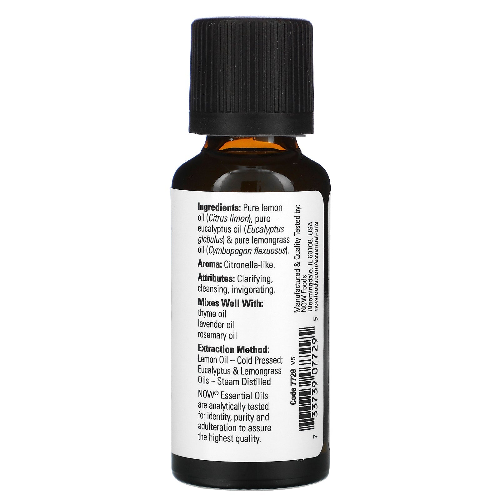 Purity Tested/Quality Assured Aroma: Citronella-like. Attributes: Clarifying, cleansing, invigorating. Extraction Method: Lemon oil - Cold pressed; Eucalyptus & Lemongrass oils - Steam DistilledSugg. UseMixes Well With: Thyme oil, lavender oi
