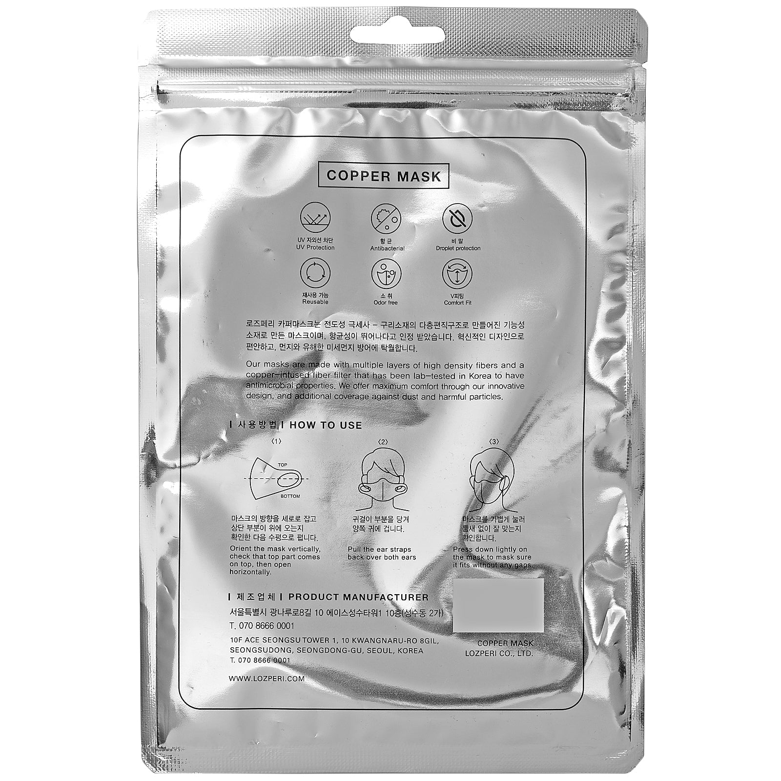 Made in Korea Made with Copper Infused Fabric Copper is Scientifically-Proven to be Anti-Microbial Bacteria UV Protection Antibacterial Droplet Protection Reusable Odor Free Comfort Fit Our masks are made with multiple layers of high density fibers and a
