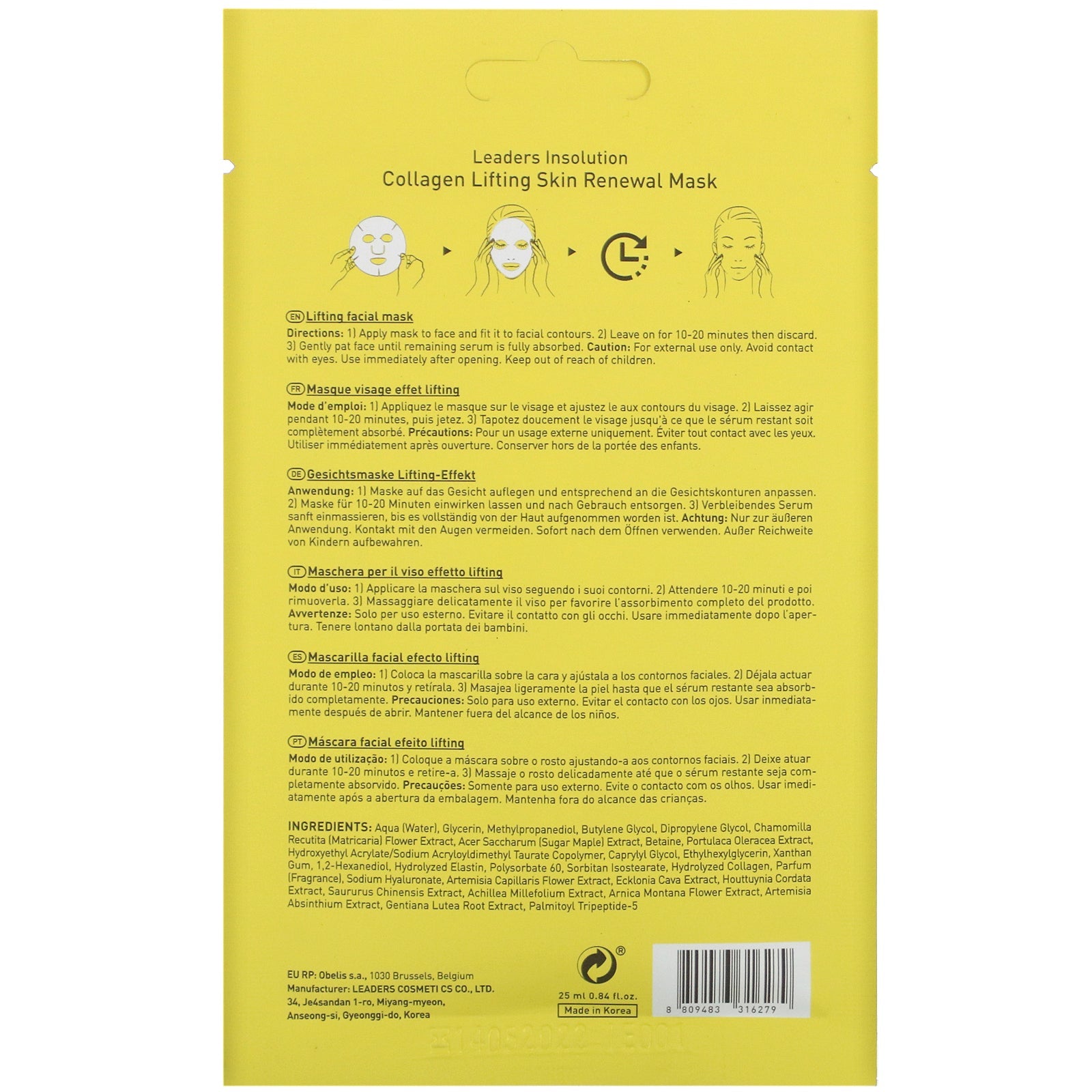 Leaders, Collagen Lifting, Skin Renewal Mask, 1 Sheet, 0.84 fl oz (25 ml)