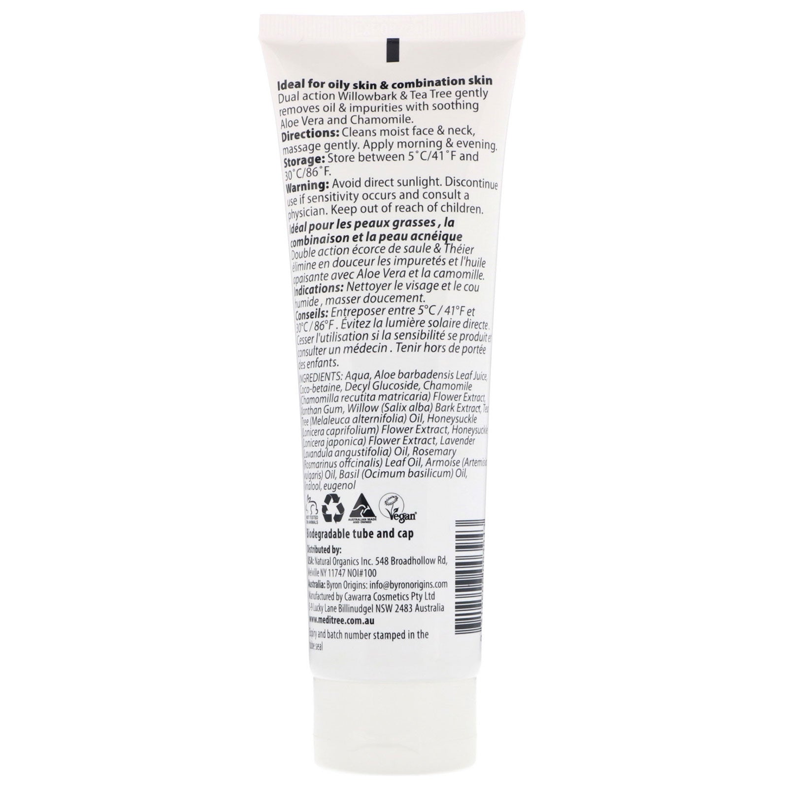Ideal for Oily Skin & Combination Skin. Not Tested on Animals Vegan Biodegradable Tube and Cap Dual action Willowbark & Tea Tree gently removes oil & impurities with soothing Aloe Vera and Chamomile.Sugg. UseCleans moist face & ne