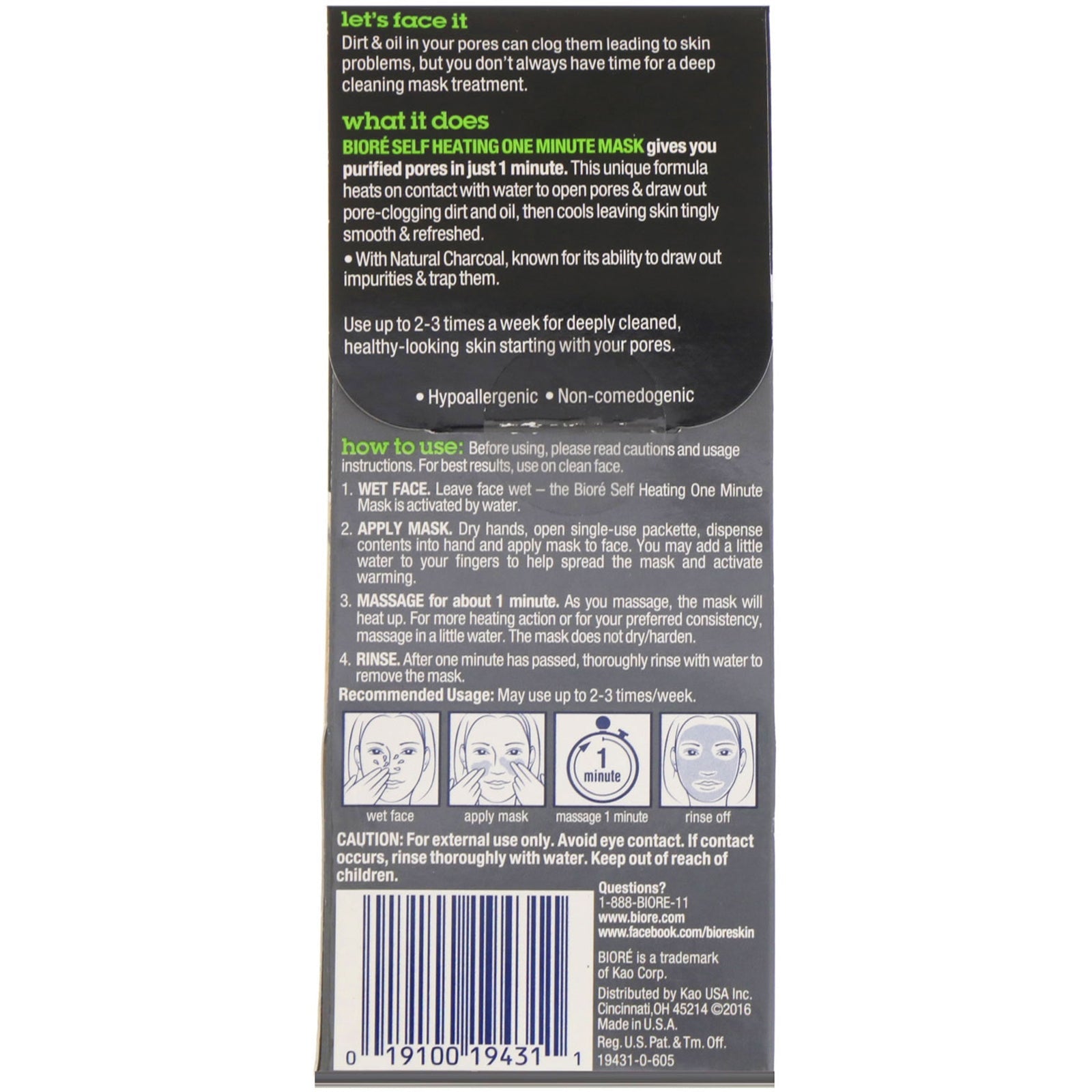 Biore, Self Heating One Minute Mask, Charcoal, 4 Single Use Packs, 0.25 oz (7.0 g) Each