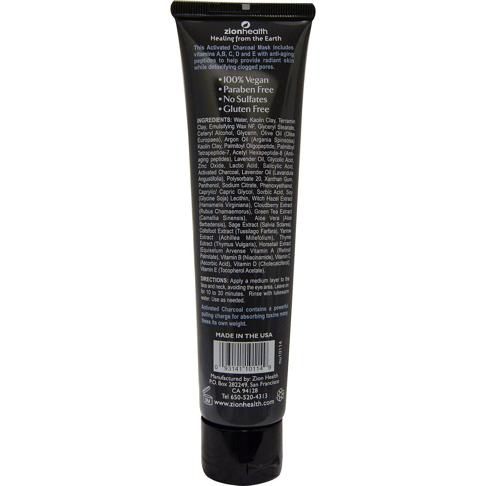 With Active Charcoal Anti-Aging Peptides Clarify 100% Vegan Paraben Free No Sulfates Gluten Free Zion Health- Healing from the Earth This Activated Charcoal Mask includes vitamins A, B, C, D and E with anti-aging peptides to help provide radiant skin whil