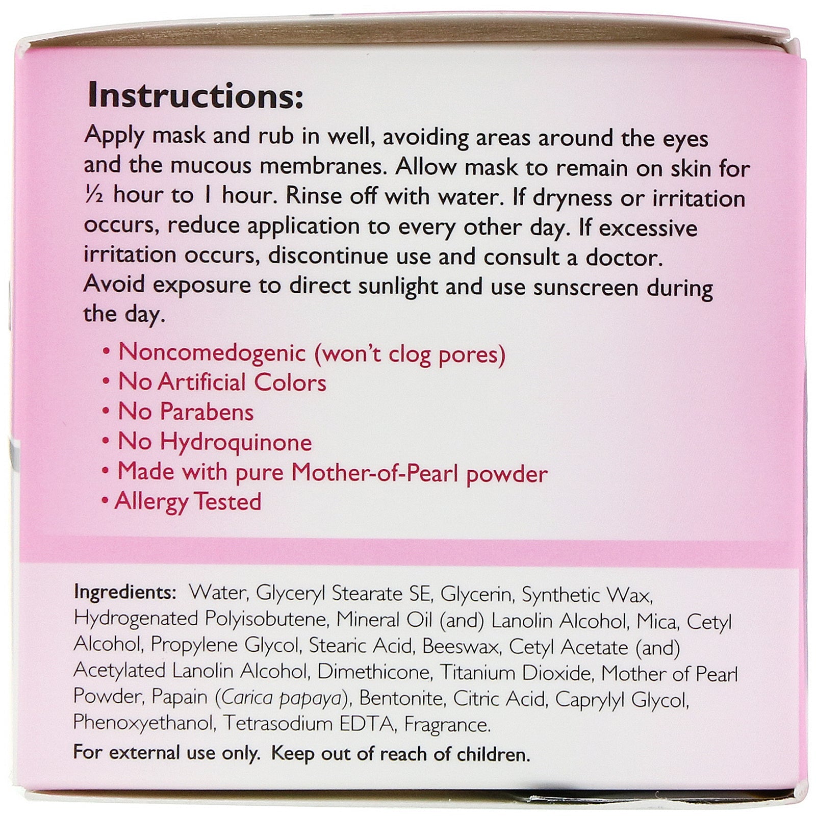 Allergy Tested Brightens and Beautifies the Skin Noncomedogenic (Won't Clog Pores) No Artificial Colors No Parabens No Hydroquinone Made with Pure Mother-of-Pearl Powder Our unique allergy tested formula features pure Mother of Pearl powder plus moisturiz