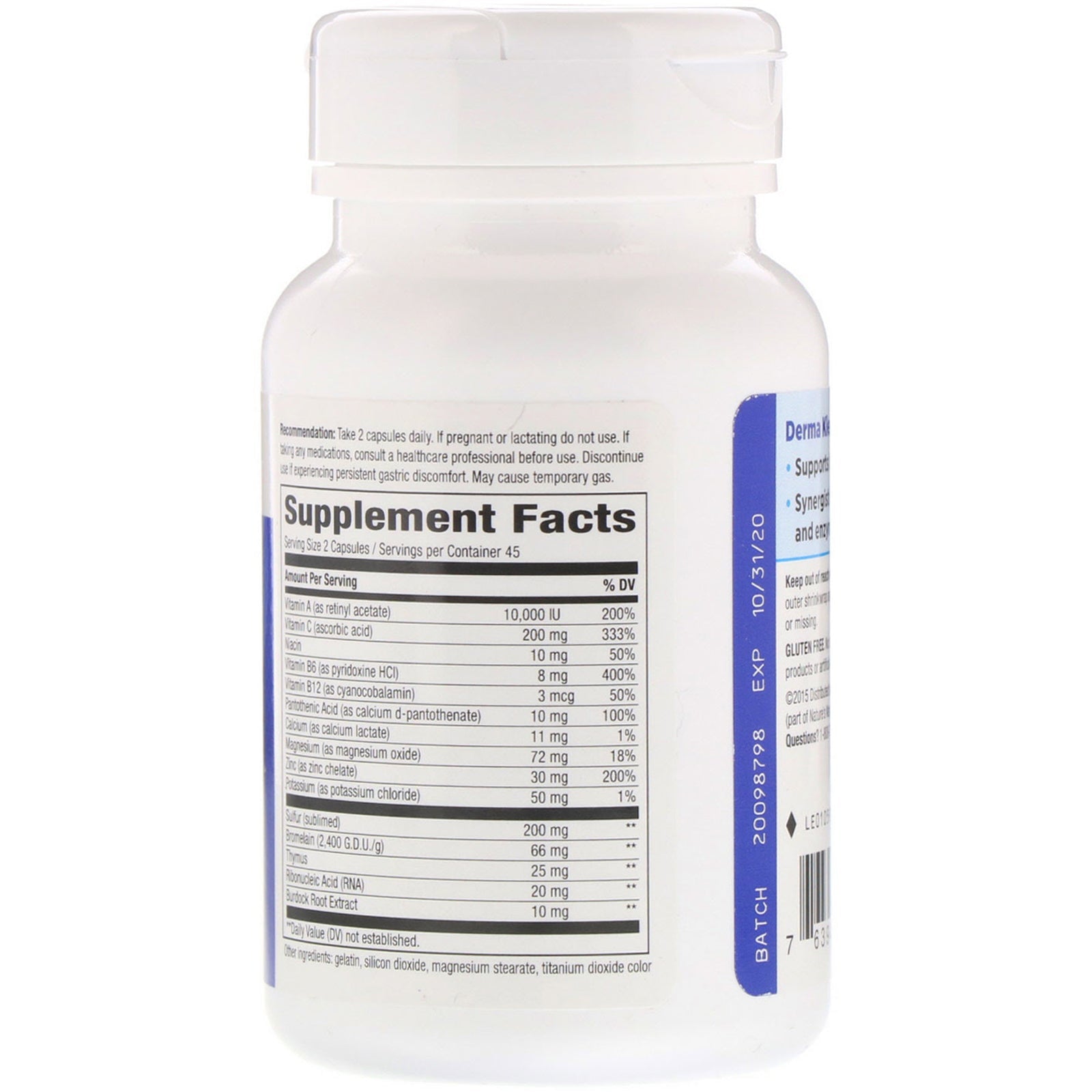 Dietary Supplement Supports Healthy Skin Synergistic Vitamin, Mineral, Herb and Enzyme BlendSugg. UseTwo capsules daily.Other IngredientsGelatin, silicon dioxide, magnesium stearate, titanium dioxide color. Gluten free. No sugar, salt, yeast, wheat, soy, dairy products or artificial flavors.Supplement FactsServing Size: 2 Capsules Servings Per Container: 45 Amount Per Serving %Daily Value Vitamin A (as retinyl acetate) 10,000 IU 200% Vitamin C (ascorbic acid) 200 mg 333% Niacin 10 mg 50% Vitamin B6 (as pyridoxine HCI) 8 mg 400% Vitamin B12 (as cyanocobalamin) 3 mcg 50% Pantothenic Acid (as calcium d-pantothenate) 10 mg 100% Calcium (as calcium lactate) 11 mg 1% Magnesium (as magnesium oxide) 72 mg 18% Zinc (as zinc chelate) 30 mg 200% Potassium (as potassium chloride) 50 mg 1% Sulfur (sublimed) 200 mg ** Bromelain (2,400 G.D.U./g) 66 mg ** Thymus 25 mg ** Ribonucleic Acid (RNA) 20 mg ** Burdock Root Extract 10 mg ** **Daily Value (DV) not...