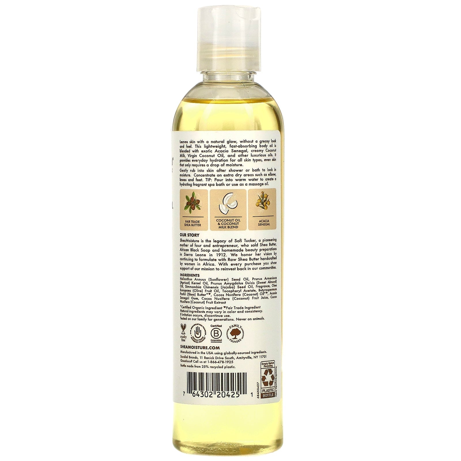 Established 1912 w/ Coconut Milk & Acacia Senegal Soften & Restore Skin Made with Fair Trade Shea Butter Fair Trade Shea Butter Coconut Oil & Coconut Milk Blend Acacia Senegal Cruelty Free Our SheaMoisture Promise - Ethically Traded Sustainably Produced Certified B Corporation Family Founded Formulated with No Parabens No Phthalates No Mineral Oil No Animal Testing No Petrolatum Leaves skin with a natural glow, without a greasy look and feel. This lightweight, fast-absorbing body oil is blended with exotic Acacia Senegal, creamy Coconut Milk, Virgin Coconut Oil, and other luxurious oils. It provides everyday hydration for all skin types, even skin that only requires a drop of moisture. Tested on our family for generations. Never on animals.Sugg. UseGently rub into skin after shower or bath to lock in moisture. Concentrate on extra dry areas such as elbow, knees and feet. Tip: Pour into warm water to create a hydrating...