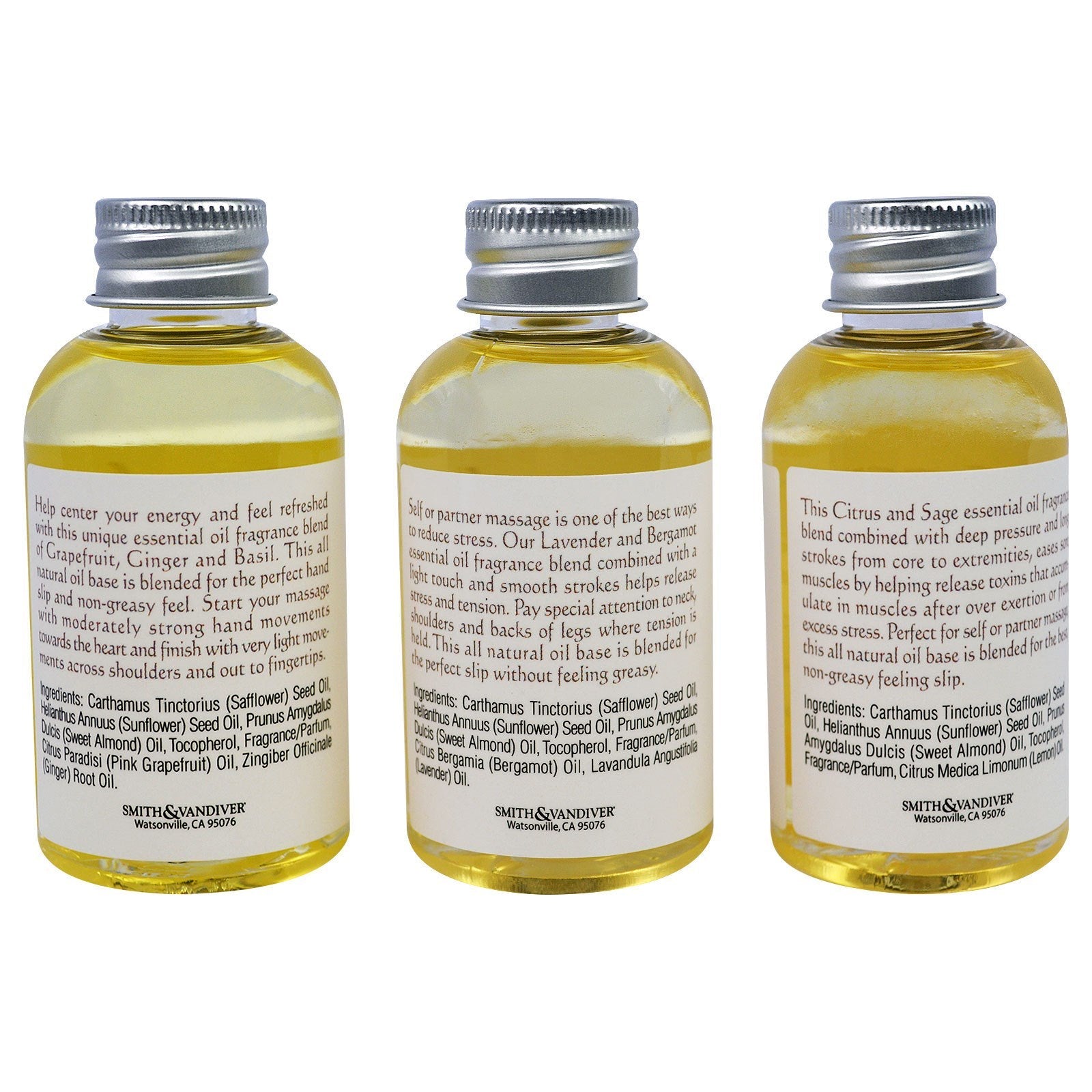 Contains: Rejuvenation - Ginger - Grapefruit - Basil, 2 fl oz (60 ml) Stress Release - Lavender - Bergamot, 2 fl oz (60 ml) Sore Muscle - Sage Citrus, 2 fl oz (60 ml) Sage - Citrus Sore Muscles This Citrus and Sage essential oil fragrance blend combined with deep pressure and long strokes from core to extremities, eases sore muscles by helping release toxins that accumulate in muscles after over exertion or from excess stress. Perfect for self or partner massage, this all natural oil base is blended for the best, non-greasy feeling slip. Lavender - Bergamot Stress Release Self or partner massage is one of the best ways to reduce stress. Our Lavender and Bergamot essential oil fragrance blend combined with a light touch and smooth strokes helps release stress and tension. Pay special attention to neck, shoulders, and backs of legs where tension is held. This all natural oil based is blended for the perfect slip without feeling greasy. Ginger - Grapefruit - Basil - Rejuvenation Help center your energy and feel refreshed with this unique essential oil fragrance blend of Grapefruit, Ginger and Basil. This all natural oil base is blended for the perfect hand slip and non-greasy feel. Start your massage with moderately strong hand movements towards the heart and finish with very light movements across shoulders and out to fingertips.
