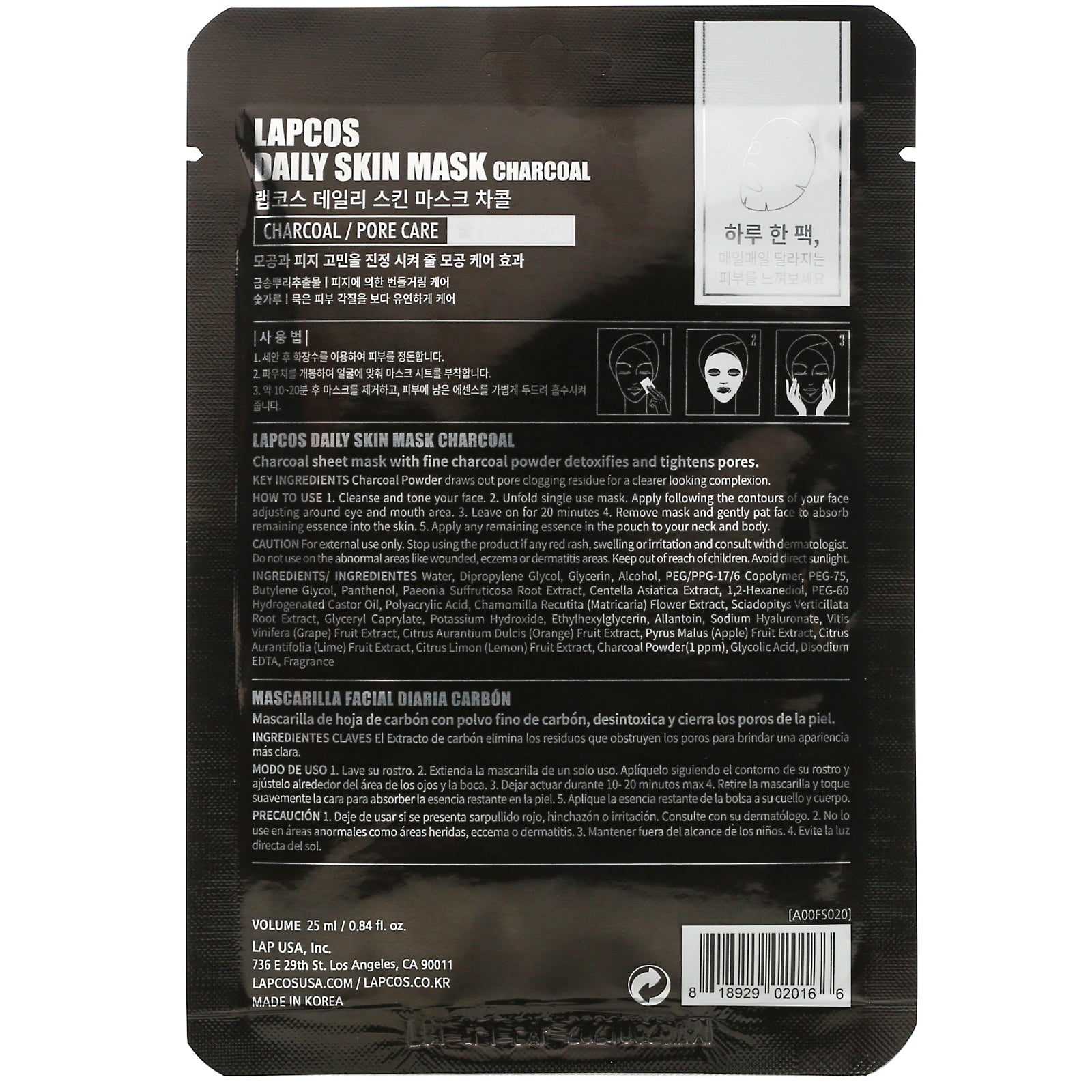 Lapcos Daily Skin Mask Charcoal Charcoal sheet mask with fine charcoal powder detoxifies and tightens pores. Key Ingredients: Charcoal Powder draws out pore clogging residue for a clearer looking complexion.Sugg. UseHow To Use Cleanse and tone