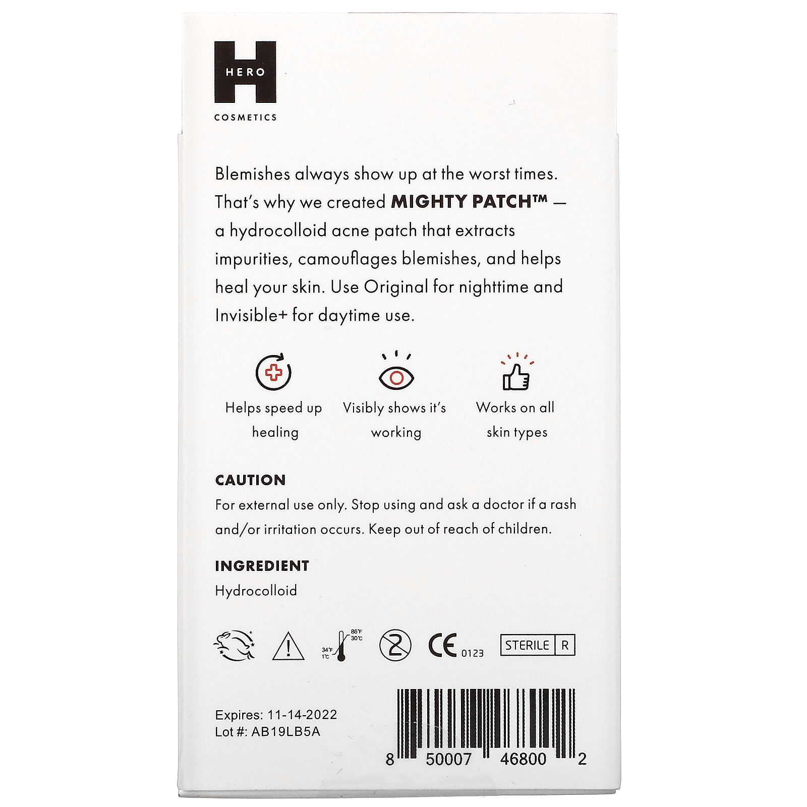 Your Blemish Hero Visibly Show's It's Working Protects for Faster Healing Drug-Free and Non-Drying 6 x Original for Night 6 x Invisible+ for Day Helps Speed Up Healing Works on All Skin Types Leaping Bunny Certified Sterile R Blemishes always show up at t