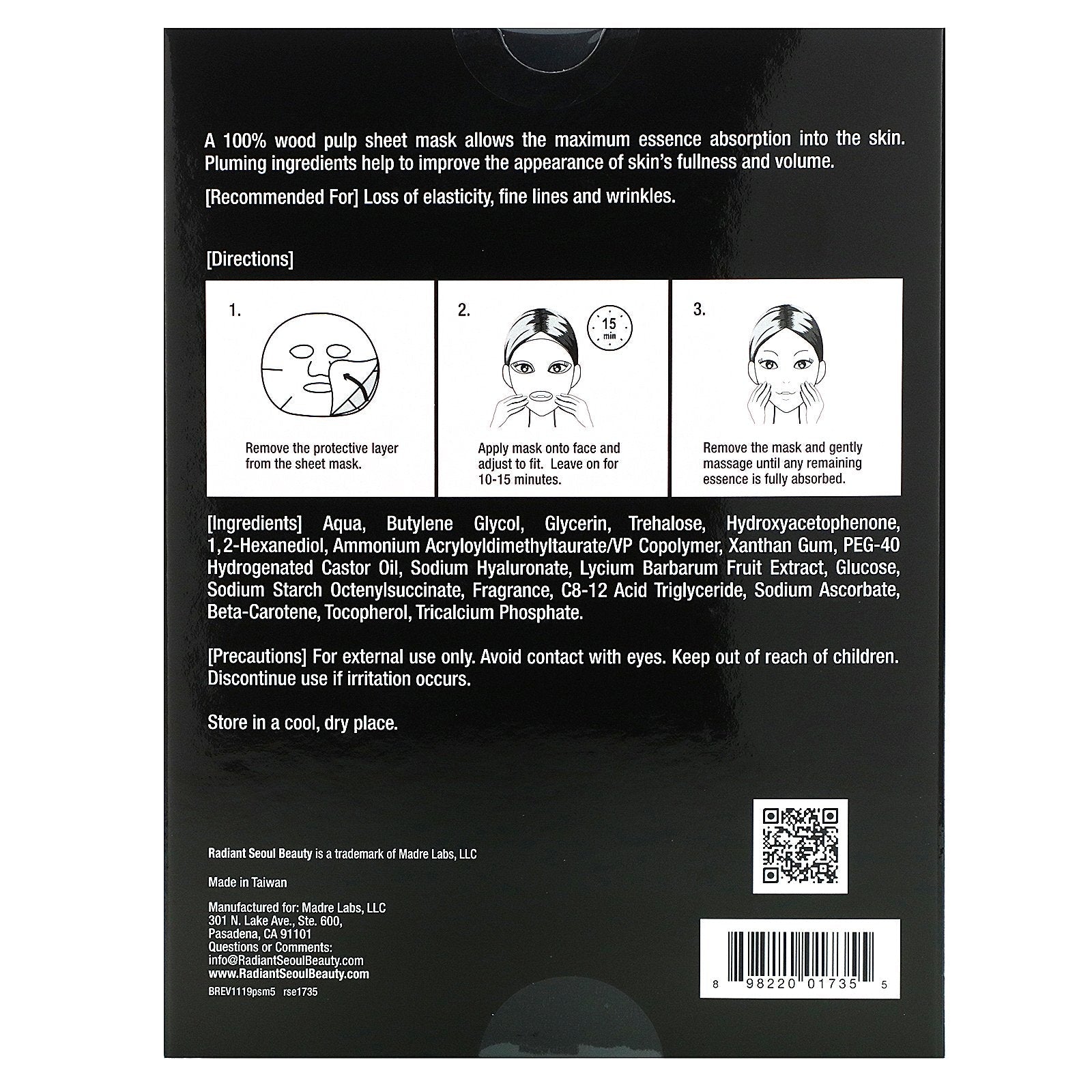 Radiant Seoul Beauty ™ Plumping Sheet Masks Hyaluronic Acid, Trehalose & Lycium Barbarum Recommended For Fine Lines, Wrinkles & Improved Elasticity Natural Moisturizing Factors Enhance Skin’s Fullness & Volume Biodegradable 100% Wood Pulp