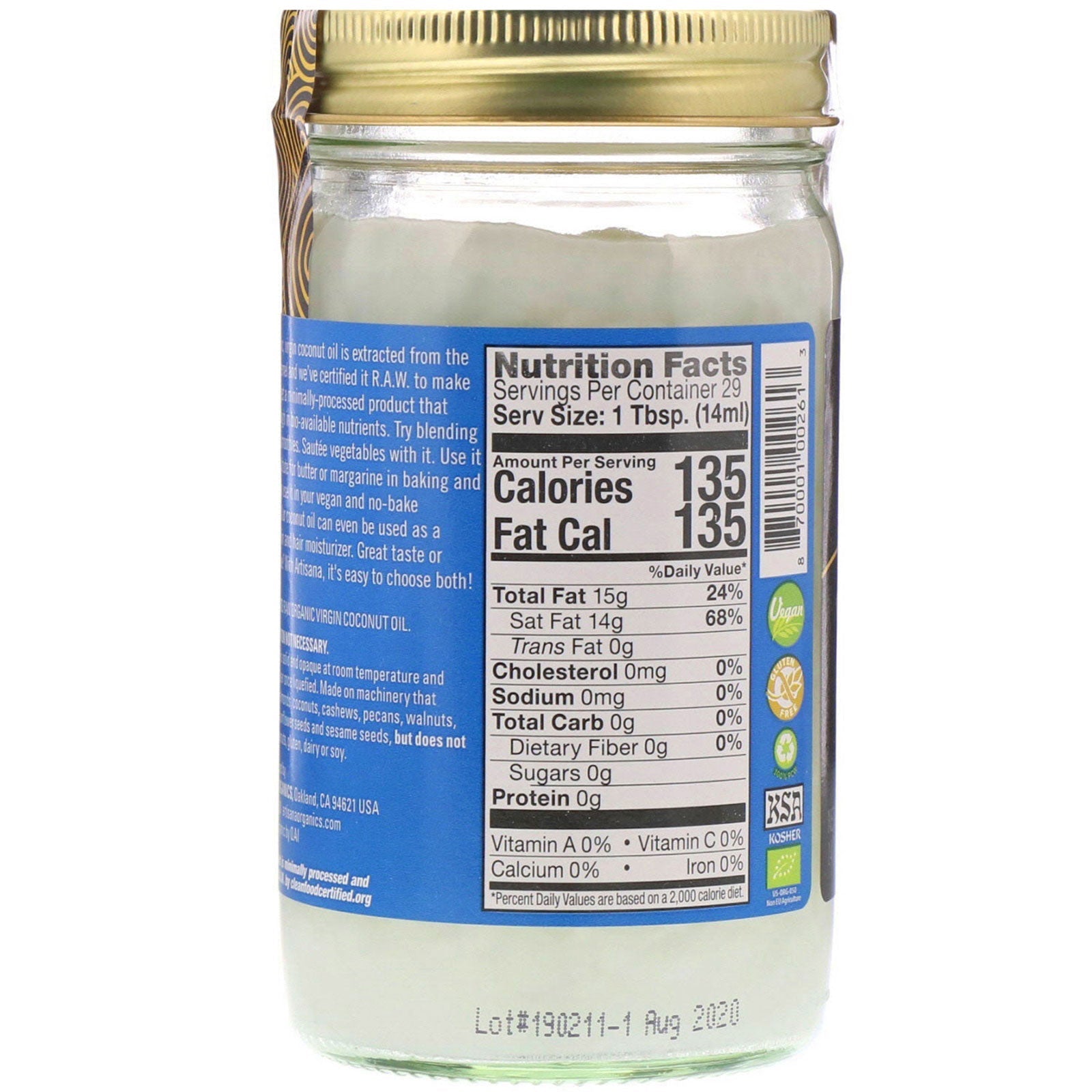 Non GMO Project Verified USDA Certified by QAI Vegan Gluten Free Kosher Make a healthy choice for your whole body. Our , virgin coconut oil is freshly extracted from the living coconut kernel, and delivered to you, raw and non-hydrogenated. Blend it in your smoothies. Use it in baking and frying as a healthy substitute for butter or margarine. Or, go ahead and rub this natural moisturizer right on your skin. Great taste or great nutrition? With Artisana, it's easy to choose both!Sugg. UseRefrigeration not necessary.Other Ingredients raw virgin coconut oil. Made on machinery that processes tree nuts but does not process peanuts, gluten, dairy or soy.Supplement FactsServing Size: 1 Tbsp (14 g) Servings Per Container: 29 Amount Per Serving %Daily Value* Calories 135 Fat Cal 135 Total Fat 15 g 24% Saturated Fat 14 g 68% Trans Fat 0 g Cholesterol 0 mg 0% Sodium 0 mg 0% Total...