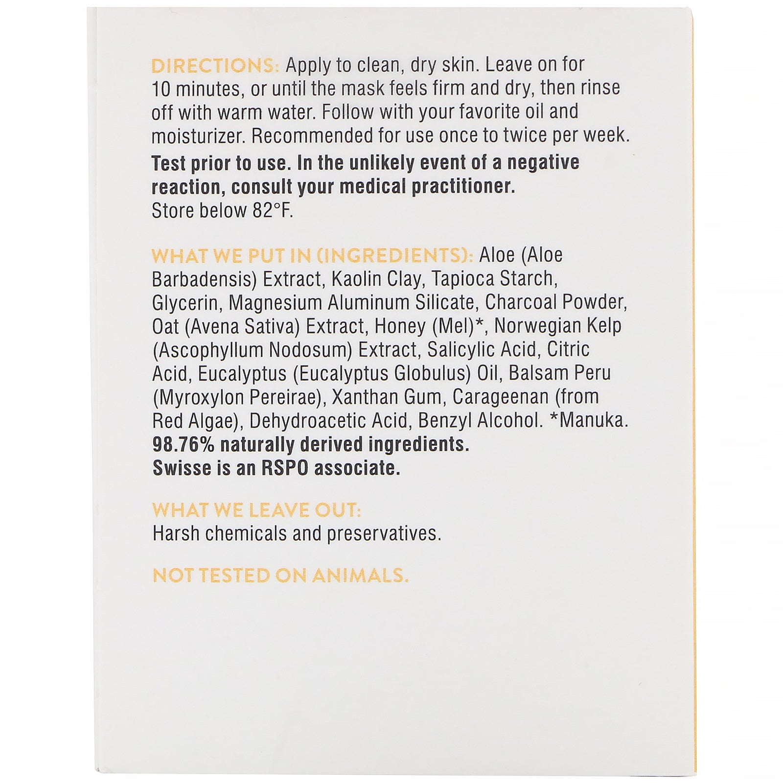 With Charcoal & Australian Kaolin Clay Glow Combination Skin Natural Skincare Not Tested on Animals Sulfate Free Petrolatum Free Paraben Free Swisse Manuka Honey Cleansing Clay Mask is formulated with Australian kaolin clay for a luxurious, purifying