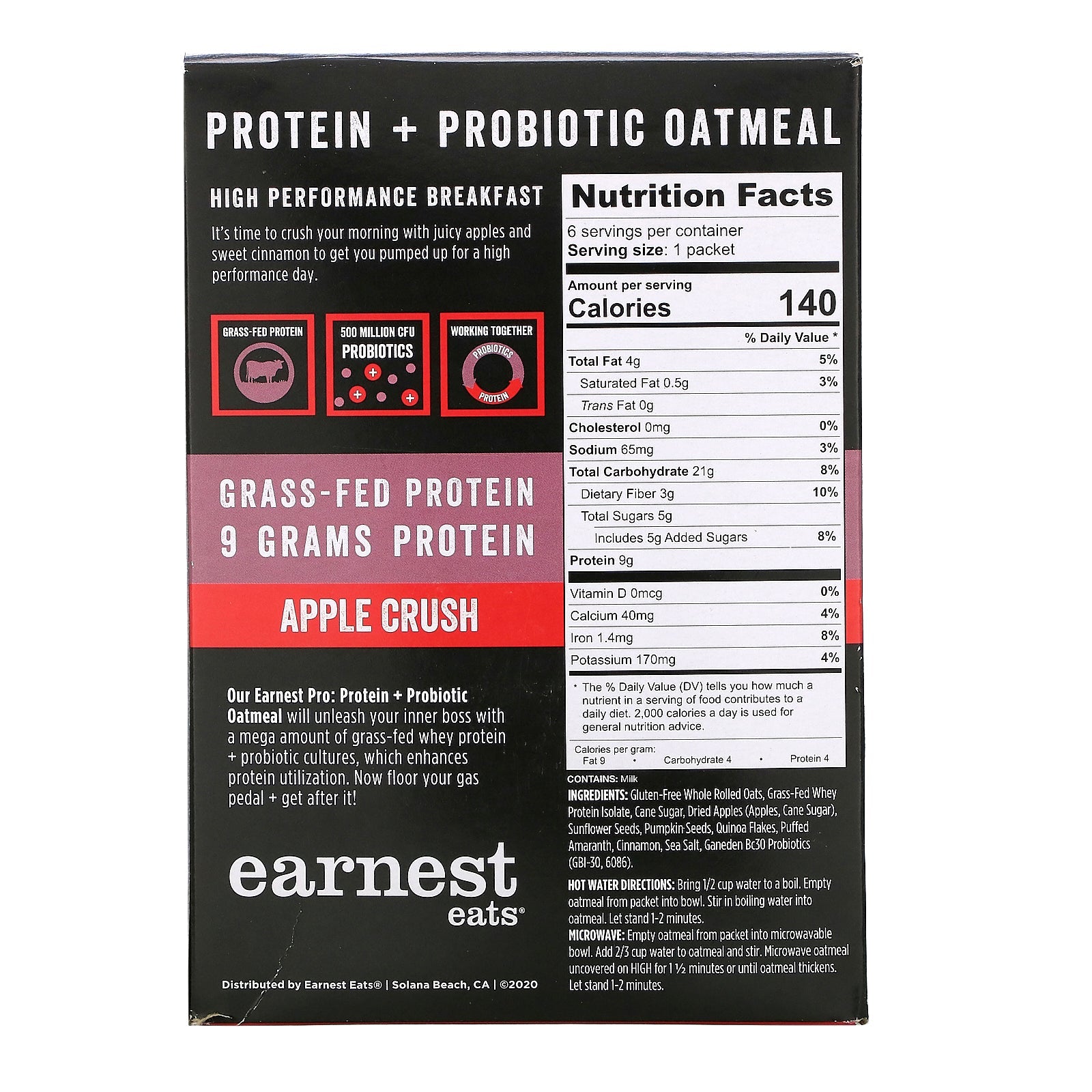 9 g Protein Kosher Gluten Free Non-GMO High Performance A.M. Brekky With Hustle High Performance Breakfast Grass-Fed Protein 500 Million CFU Probiotics Probiotics / Protein Working Together It's time to crush your morning with juice apples and sweet cinnamon to get you pumped up for a high performance day. Our Earnest Pro: Protein + Probiotic Oatmeal will unleash your inner boss with a mega amount of grass-fed whey protein + probiotic cultures, which enhances protein utilization. Now floor your gas pedal + get after it!