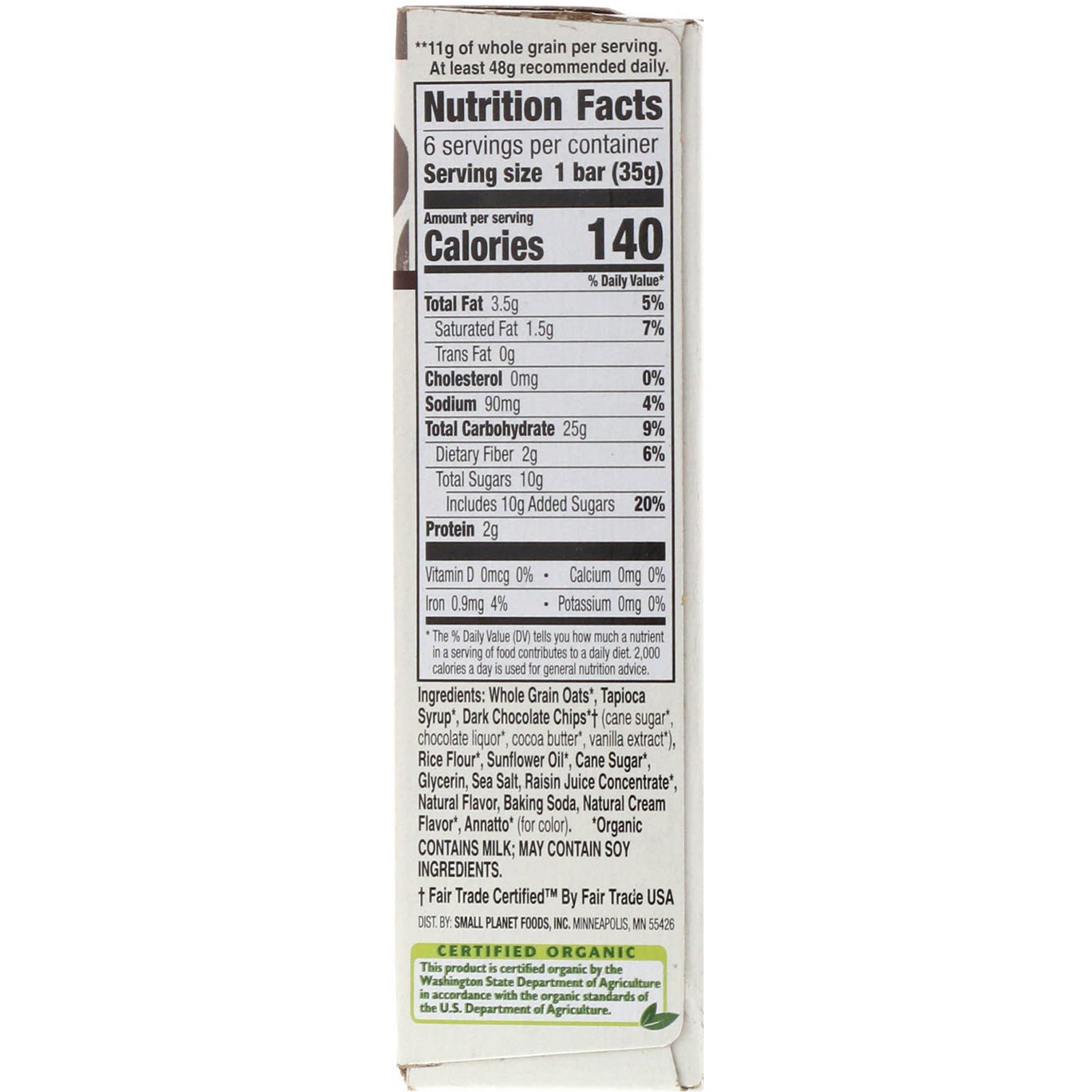 Whole grain oats*, tapioca syrup*, dark chocolate chips*† (cane sugar*, chocolate liquor*, cocoa butter*, vanilla extract*), rice flour*, sunflower oil*, cane sugar*, glycerin, sea salt, raisin juice concentrate*, natural flavor, baking soda, natural cream flavor*, annatto* (for color). Contains milk; may contain soy ingredients. *. †Fair Trade certified™ by Fair Trade USA.Supplement Facts