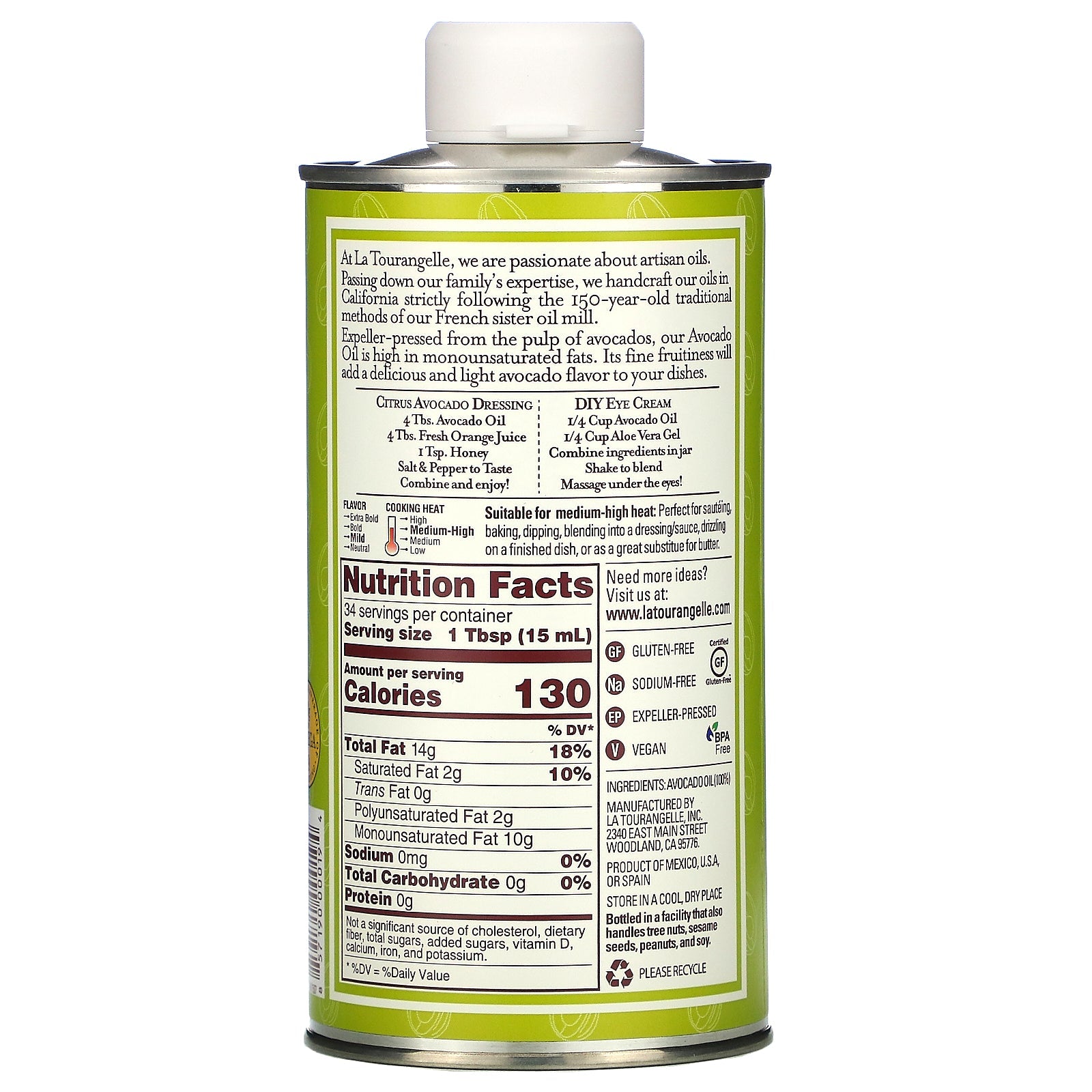 Cooking | Body Care Artisan Oils Non GMO Project Verified Kosher Contains an Average of 8g of Omega 9 Per Serving Expeller Pressed Sodium-Free Vegan Certified Gluten-Free BPA Free Handcrafted from premium avocados. Distinctive, flavorful and all-natural. At La Tourangelle, we are passionate about artisan oils. Passing down our family's expertise, we handcraft out oils in California strictly following the 150-year-old traditional methods of our French sister oil mill. Expeller-pressed from the pulp of avocados, our Avocado Oil is high in monounsaturated fats. Its fine fruitiness will add a delicious and light avocado flavor to your dishes. Heat | Flavor Medium-High | MildSugg. UseSuitable for medium-high heat: Perfect or sauteing, baking, dipping, blending into a dressing/sauce, drizzling on a finished dish, or as a great substitute for butter.Other IngredientsAvocado oil (100%). Bottle in a facility that also handles tree nuts, sesame seeds, peanuts, and soy.Supplement FactsServing Size: 1 Tbsp (15...