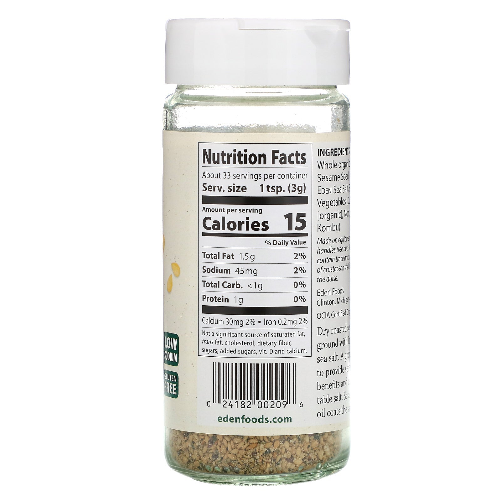 Sesame Seeds, Seaweed & Sea Salt OCIA Certified dry roasted sesame seed ground with Eden sea salt, and the mineral rich sea vegetables kombu, dulse, and nori. Replaces table salt. Sesame oil coats the salt and greatly reduces its harshness. Low sodi