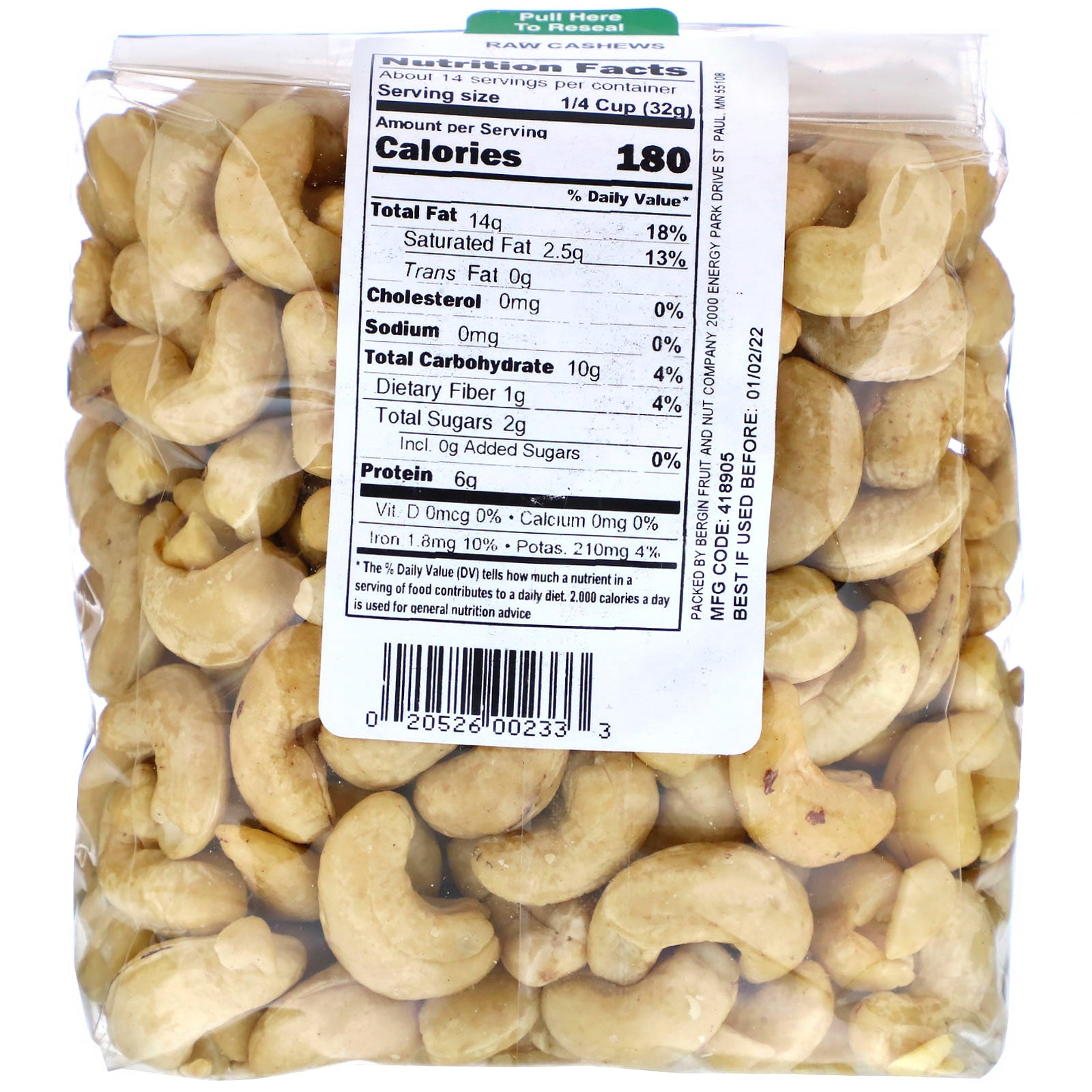 Raw CashewsSugg. UseOther IngredientsRaw cashews-steam pasteurized. Contains: cashew. Processed on shared equipment with peanuts, tree nuts, soy, milk, egg, or wheat products.Supplement FactsServing Size: 1/4 Cup (32 g) Servings Per Container: About 14 Amount Per Serving % Daily Value* Calories 180 Total Fat 14 g 18% Saturated Fat 2.5 g 13% Trans Fat 0 g Cholesterol 0 mg 0% Sodium 0 mg 0% Total Carbohydrate 10 g 4% Dietary Fiber 1 g 4% Total Sugars 2 g Incl. 0 g Added Sugars 0% Protein 6 g Vitamin D 0 mcg 0% Calcium 0 mg 0% Iron 1.8 mg 10% Potassium 210 mg 4% *The % Daily Value (DV) tells you how much a nutrient in a serving of food contributes to a daily diet. 2,000 calories a day is used for general nutrition advice.DisclaimerWhile VitaminsUK strives to ensure the accuracy of its product images and information, some manufacturing changes to...