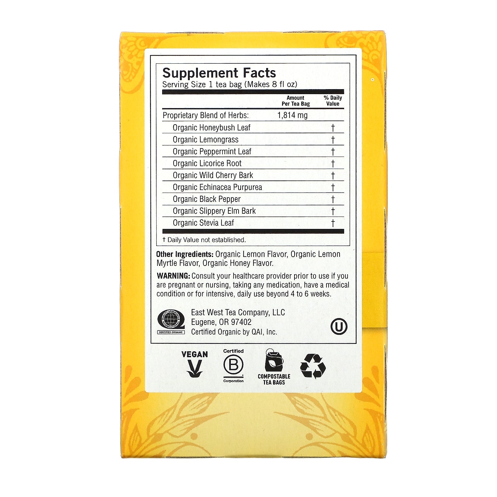 Soothes the Throat Herbal Supplement Non-GMO Project Verified USDA Organic Certified Organic by QAI, Inc. Kosher Vegan Certified B Corporation Compostable Tea Bags When You Need a Little Throat Comfort ® This herbal formula, flavored with Honey and Lemon
