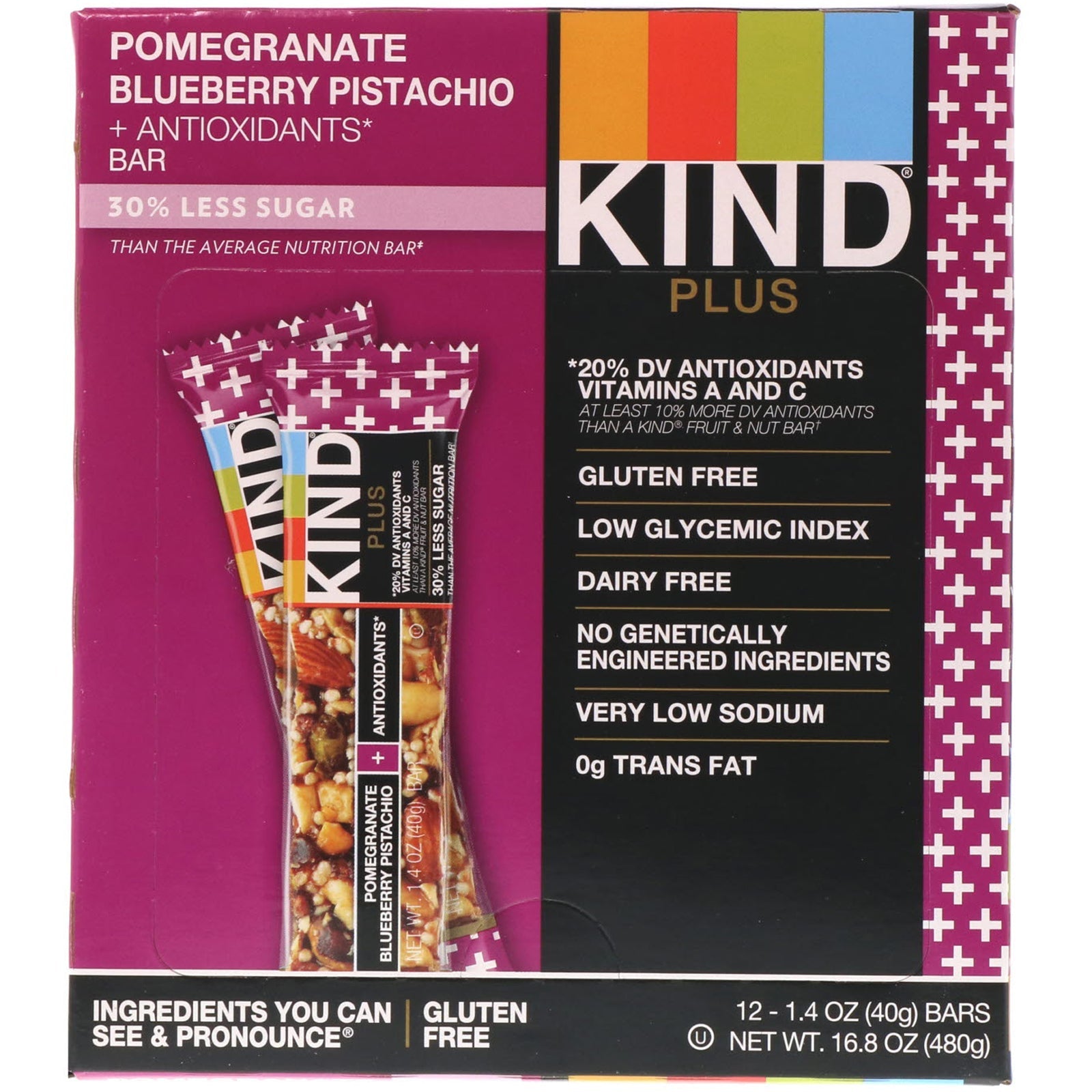 30% Less Sugar - Than the Average Nutrition Bar‡ *20% DV Antioxidants - At least 10% More DV Antioxidants Than a Kind Fruit & Nut Bar† Vitamin A, C Gluten Free Low Glycemic Index Dairy Free No Genetically Engineered Ingredients Very Low Sodium 0 g Trans Fat Ingredients you Can See and Pronounce Kosher †This bar contains 183 mcg Vitamins A and 19 mg Vitamin C. A KIND fruit & nut bar contains 0 mcg Vitamin A and 0 mcg Vitamin C. ‡This bar contains 8 g sugar; the average nutrition bar contain bar contains 12 g sugar. Do the Kind Thing for your body, your taste buds & your world Welcome to KIND community! Here at KIND, we think a little differently. Instead of "or" we say "and". We choose healthy and tasty, convenient and wholesome, economically sustained and socially impactful. From the snacks and foods, we make, to the way we work, live, and given back, our goal is to make KIND not just a brand, but also a state of mind and community to make the world a little kinder. We call this the KIND movement, which has inspired millions of unexpected acts of kindness around the world. Craving more KIND? you've come to the right place. If you like our Pomegranate blueberry taste with the sweet spice of vanilla and crunchy cashews for a snack, you'll love! As always, all KIND snacks are gluten and made from whole, simple and non-genetically engineered ingredients. Made with whole and simple ingredients, KIND snacks only taste indulgent. Whether you're at the gym, at the office, or on-the-go, KIND snacks satisfy from the first bite till the very last. This bar contains 3/4 teaspoon of added sugar. The dietary guidelines for Americans recommended a limit of 12 teaspoons as a daily added sugar intake based on a 2,000 calorie diet.
