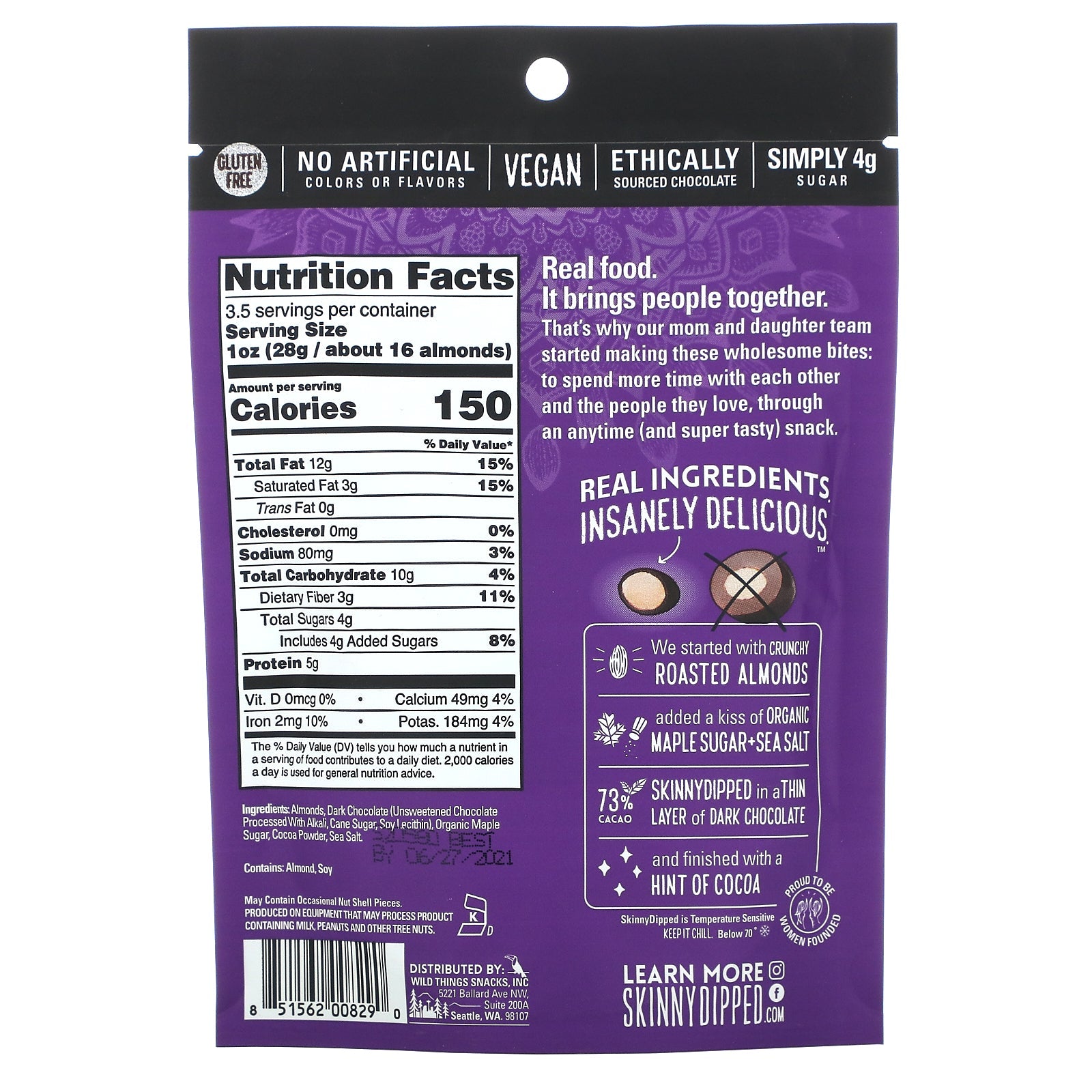 5 g Per Serving Plant Protein Real Ingredients No Sugar Alternatives 73% Cacao Non GMO Project Verified Gluten Free No Artificial Colors or Flavors Vegan Ethically Sourced Chocolate Simply 4 g Sugar Kosher Daily Real food. It brings people together. That's why our mom and daughter team started making these wholesome bites: to spend more time with each other and the people they love, through an anytime (and super tasty) snack. Real Ingredients. Insanely Delicious.™ We Started with crunch roasted almonds Added a kiss of organic maple sugar + sea salt 73% Cacao - Skinnydipped in a thin layer of dark chocolate And finished with a hint of cocoaSugg. UseOther IngredientsAlmonds, dark chocolate (unsweetened chocolate processed with alkali, cane sugar, soy lecithin), organic maple sugar, cocoa powder, sea salt. Contains: Almond, soy. May contain occasional nut shell pieces. Produced on equipment that my process product containing milk, peanuts and other...