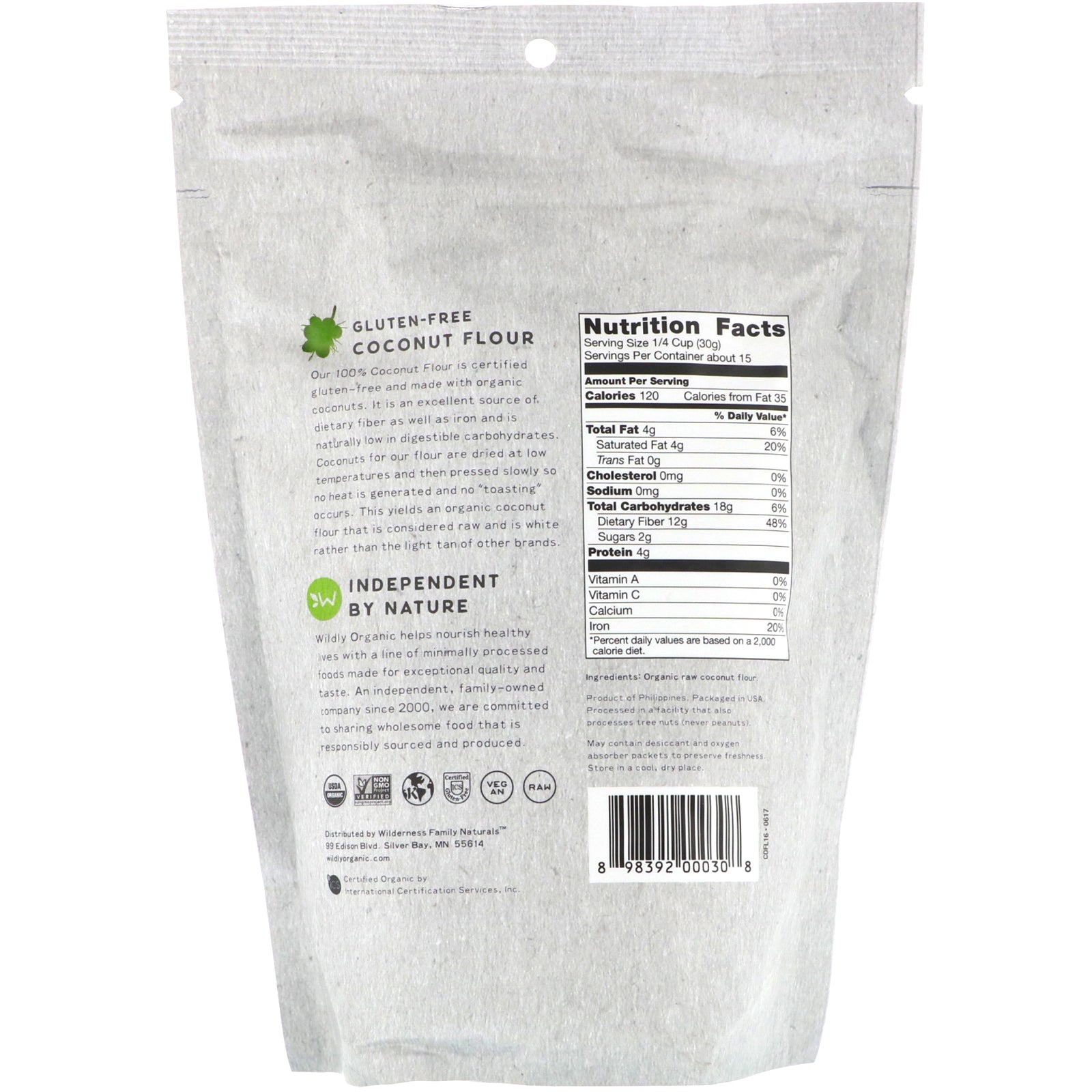 By Wilderness Family Naturals High in Fiber High in Iron USDA Non GMO Project Verified Kosher Certified Gluten Free Vegan Raw Certified by International Certification Services, Inc Gluten-Free Coconut Flour Our 100% Coconut Flour is certified gluten-free and made with coconuts. It is an excellent source of dietary fiber as well as iron and is naturally low in digestible carbohydrates. Coconuts for our flour are dried at low temperatures and then pressed slowly so no heat is generated and no "toasting" occurs. This yields an coconut flour that is considered raw and is white rather than the light tan of other brands. Independent by Nature Wildly helps nourish healthy lives with a line of minimally processed foods made for exceptional quality and taste. An independent, family-owned company since 2000, we are committed to sharing wholesome food that is responsibly sourced and produced.Sugg. UseOther Ingredients raw coconut flour. Processed in a...