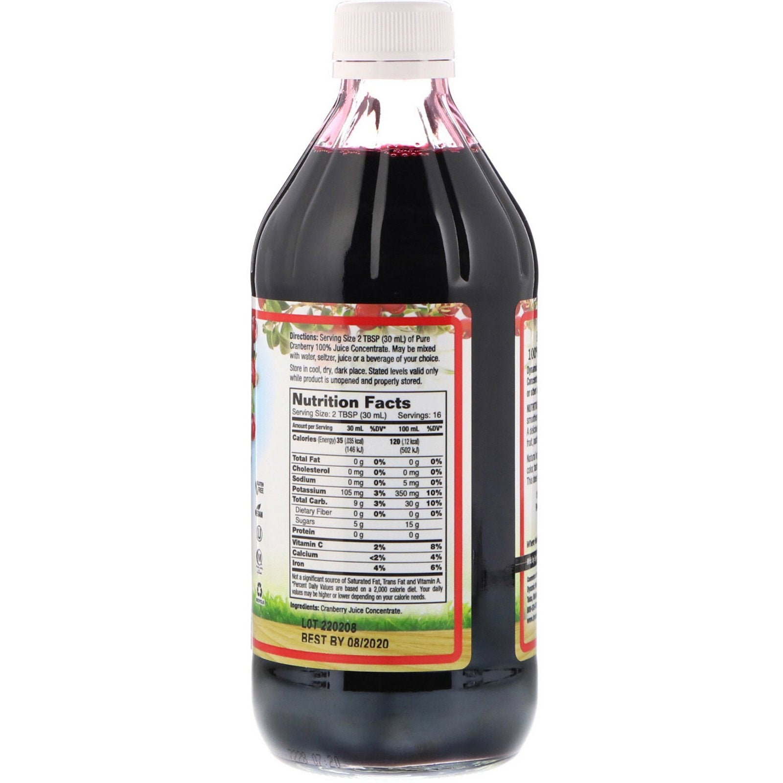 Gluten Free Vegan Kosher Halal Where Health & Flavor Meet!Sugg. UseServing Size 2 Tbsp (30 ml) of Pure Cranberry 100% Juice Concentrate. May be mixed with water, seltzer, juice or beverage of your choice. Nutritious Suggestions: Ideal for tropical smoothies, fruit cocktails and as a mixer. A delicious, natural topping for yogurt, ice cream, fruit, pastry and dessert. Shake well before using. Refrigerate after opening.Other IngredientsCranberry juice concentrate. Dynamic Health Pure Cranberry Juice Concentrate has no sweeteners, preservatives or other additives.Supplement FactsServing Size: 2 Tbsp (30 ml) Servings: 16 Amount per Serving 30 mL %DV* 100 mL %DV* Calories (Energy) 35 (.035 kcal) (146 kJ) 120 (.12 kcal) (502 kJ) Total Fat 0 g 0% 0 g 0% Cholesterol 0 mg 0% 0 mg 0% Sodium 0 mg 0% 5 mg 0% Potassium 105 mg 3% 350 mg 10% Total Carb. 9 g 3% 30 g 10% Dietary Fiber 0...