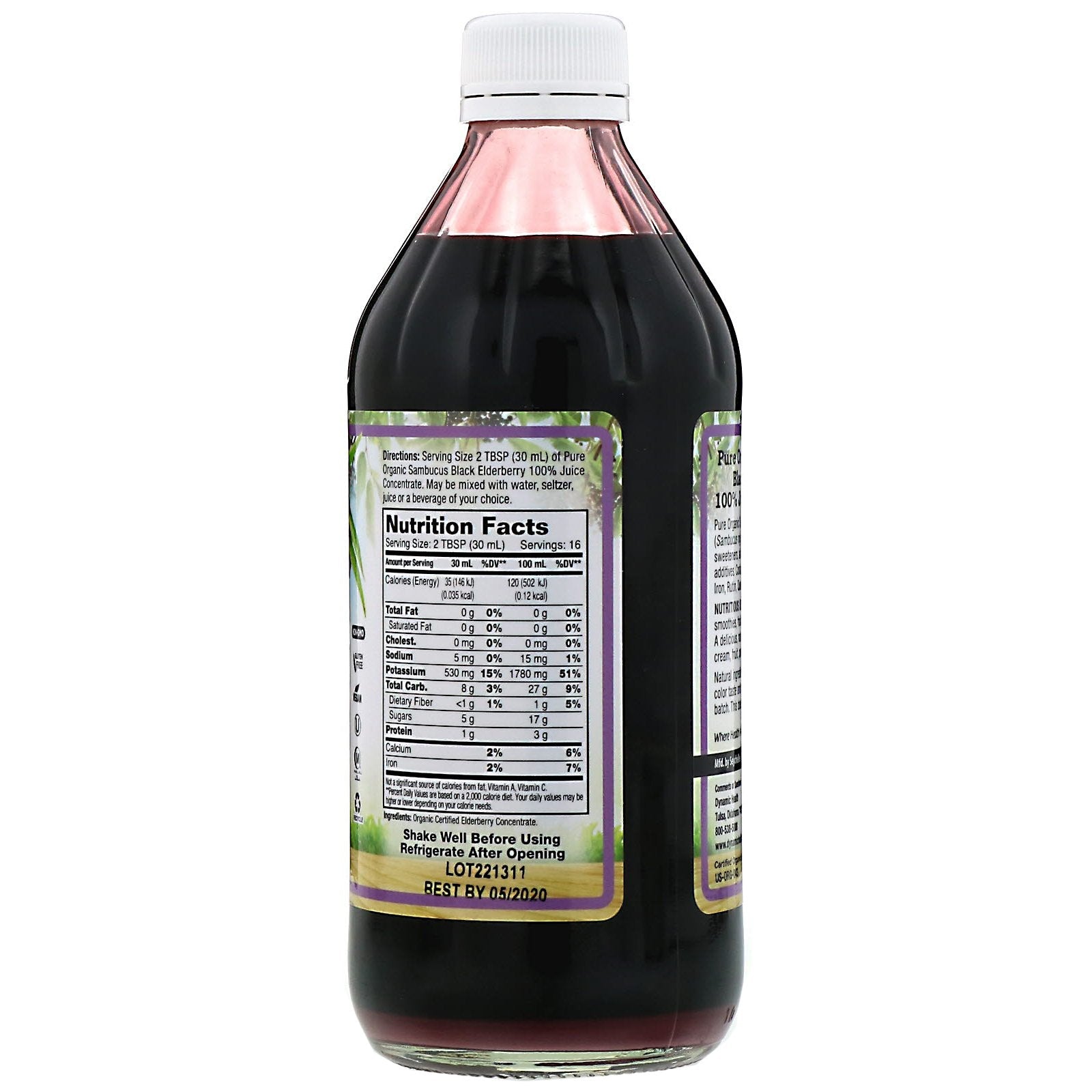 USDA Organic Non-GMO Gluten Free Vegan Kosher Halal Where Health & Flavor Meet! Certified Organic by Organic Certifiers Pure Organic Sambucus Black Elderberry (Sambucus nigra L.) Concentrate with no sweeteners, alcohol, preservatives, or other additives. Contains naturally occurring Calcium, Iron, Rutin, Quercetin, and Bioflavonoids.Sugg. UseShake well before using. Refrigerate after opening. Serving size 2 TBSP (30 ml) of Pure Organic Sambucus Black Elderberry 100% Juice Concentrate. May be mixed with water, seltzer, juice or a beverage of your choice. Nutritious Suggestions Ideal for tropical smoothies, fruit cocktails and as a mixer. A delicious, natural topping for yogurt, ice cream, fruit, pastry and dessert.Other IngredientsOrganic certified elderberry concentrate.Supplement FactsServing Size: 2 TBSP (30 ml) Servings Per Container: 16 Amount Per Serving 30 ml %DV** 100 ml %DV** Calories (Energy) 35 (146 kJ) (0.035 kcal) 120 (502 kJ) (0.12 kcal) Total Fat 0 g 0% 0 g 0 % Saturated Fat 0...
