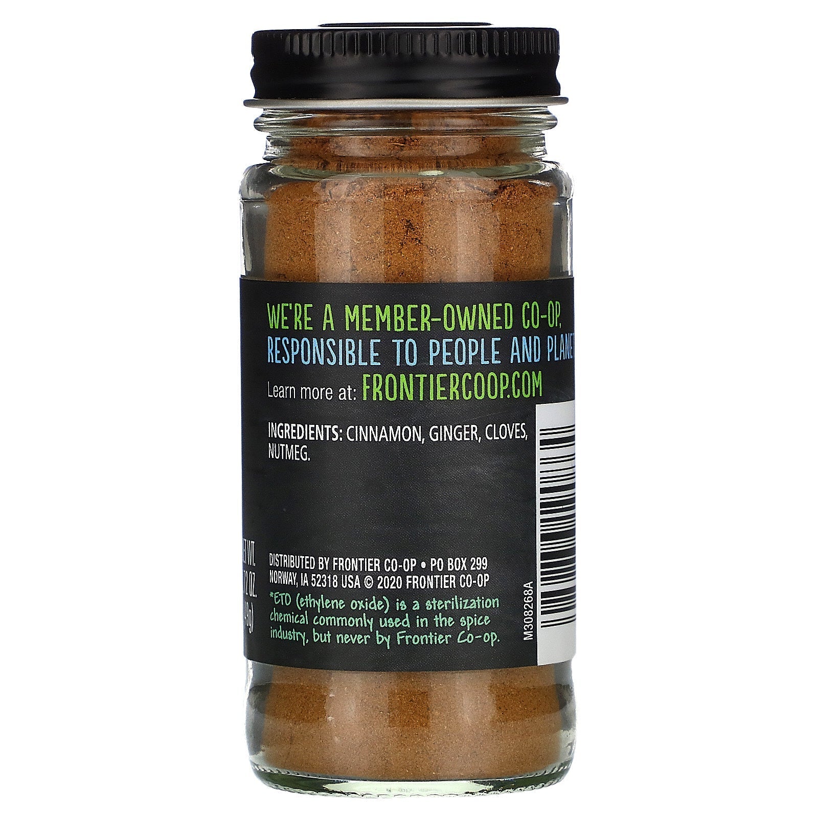 Non GMO Project Verified Kosher Non-ETO* Non-Irradiated *ETO (ethylene oxide) is a sterilization chemical commonly used in the spice industry, but never by Frontier Co-op.Sugg. UseOther IngredientsCinnamon, ginger, cloves, nutmeg.Supplement FactsDisclaimerWhile VitaminsUK strives to ensure the accuracy of its product images and information, some manufacturing changes to packaging and/or ingredients may be pending update on our site. Although items may occasionally ship with alternate packaging, freshness is always guaranteed. We recommend that you read labels, warnings and directions of all products before use and not rely solely on the information provided by VitaminsUK.