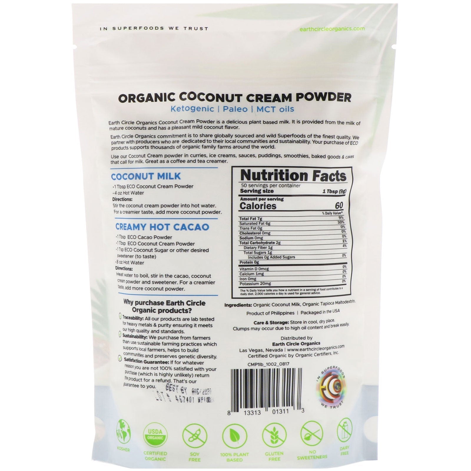 In Superfoods We Trust Ketogenic Paleo MCT Oils Dairy-Free Vegan No Added Sugar High in MCT's Tastes Delicious USDA Kosher Certified by Certifiers, Inc Soy Free 100% Plant Based Gluten Free No Sweeteners Dairy Free Earth Circle s Cream Powder is a delicious plant based milk. It is provided from the milk of mature coconuts and has a pleasant mild coconut flavor. Earth Circle s commitment is to share globally sourced and wild Superfoods of the finest quality. We partner with producers who are dedicated to their local communities and sustainability. Your purchase of ECO products supports thousands of family farms around the world. Use our Coconut Cream powder in curries, ice creams, sauces, puddings, smoothies, baked goods & cakes that call for milk. Great as a coffee and tea creamer. Traceability: All our products are lab tested for heavy metals & purity ensuring it meets our high quality and...