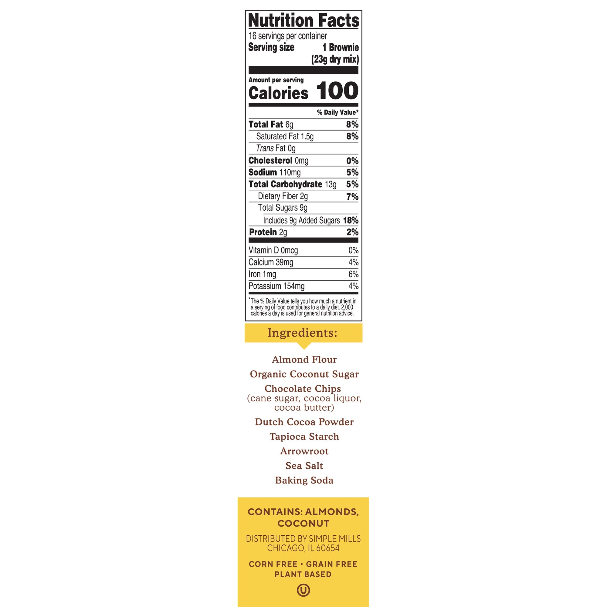 Almond flour, organic coconut sugar, chocolate chips (cane sugar, cocoa liquor, cocoa butter), dutch cocoa powder, tapioca starch, arrowroot, sea salt, baking soda. Contains: Almonds, coconutsSupplement Facts