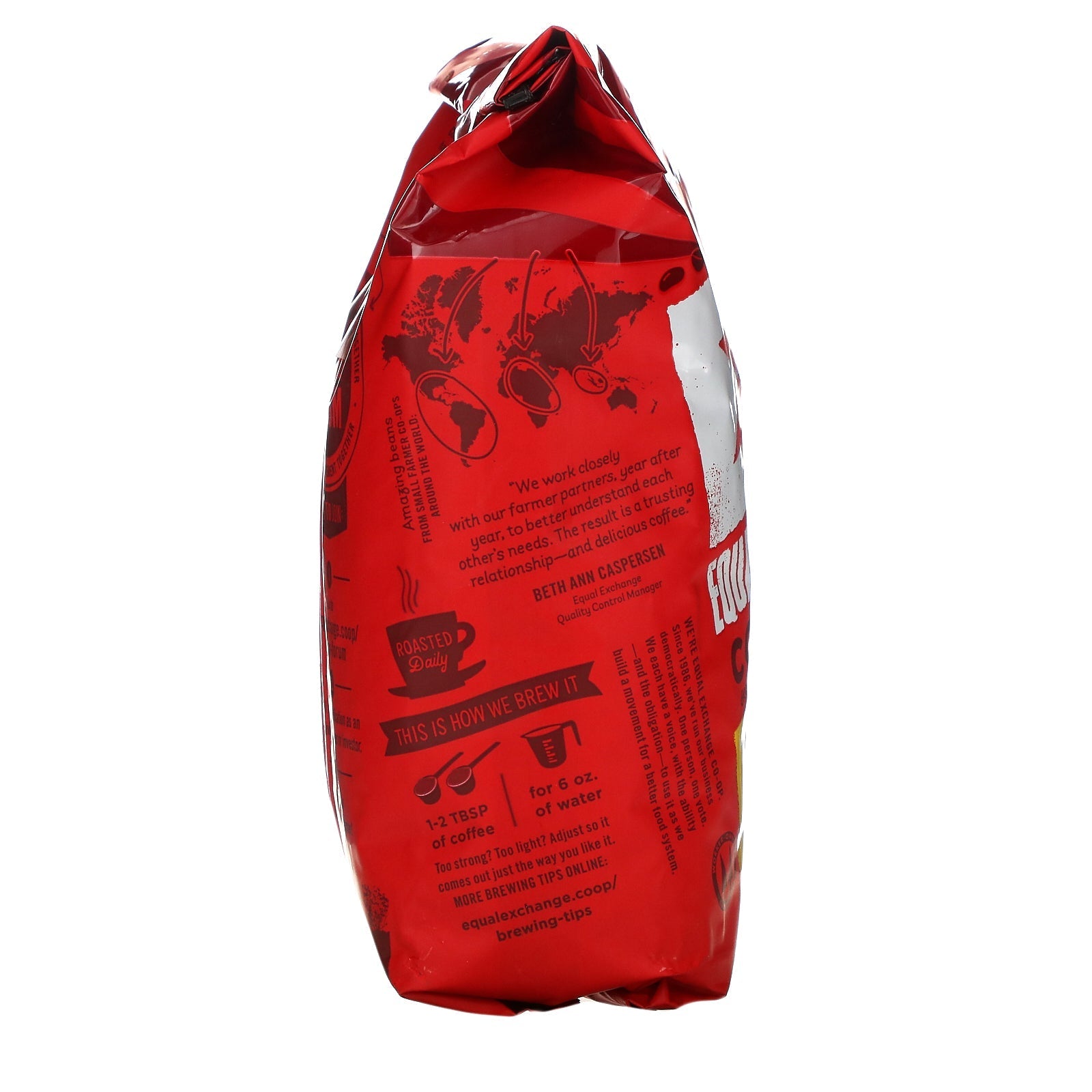 Fairly Traded USDA Blend of Medium & French Roasts Smooth & Balanced Kosher Pareve Certified by Oregon Tilth Roasted Daily Grown by Small Farmers → Collected at Farmer CO-OPS → Roasted at Equal Exchange → Brewed & Enjoyed by You! The Equal Exchange Coffee Journey These coffee beans have traveled great distances to reach your cup. At Equal Exchange, we wake up thinking about how to bridge the gap between coffee growers and coffee drinkers. We rely on our producer partners to bring us the finest coffee available. We rely on ourselves to enhance the cup characteristics with each roast. And we rely on you to purchase, protect and release the fine attributes of each coffee you brew. Amazing Beans from Small Farmer CO-OPS Around The World: "We work closely with our farmer partners, year after year, to better understand each other's needs. The result is a trusting relationship -...