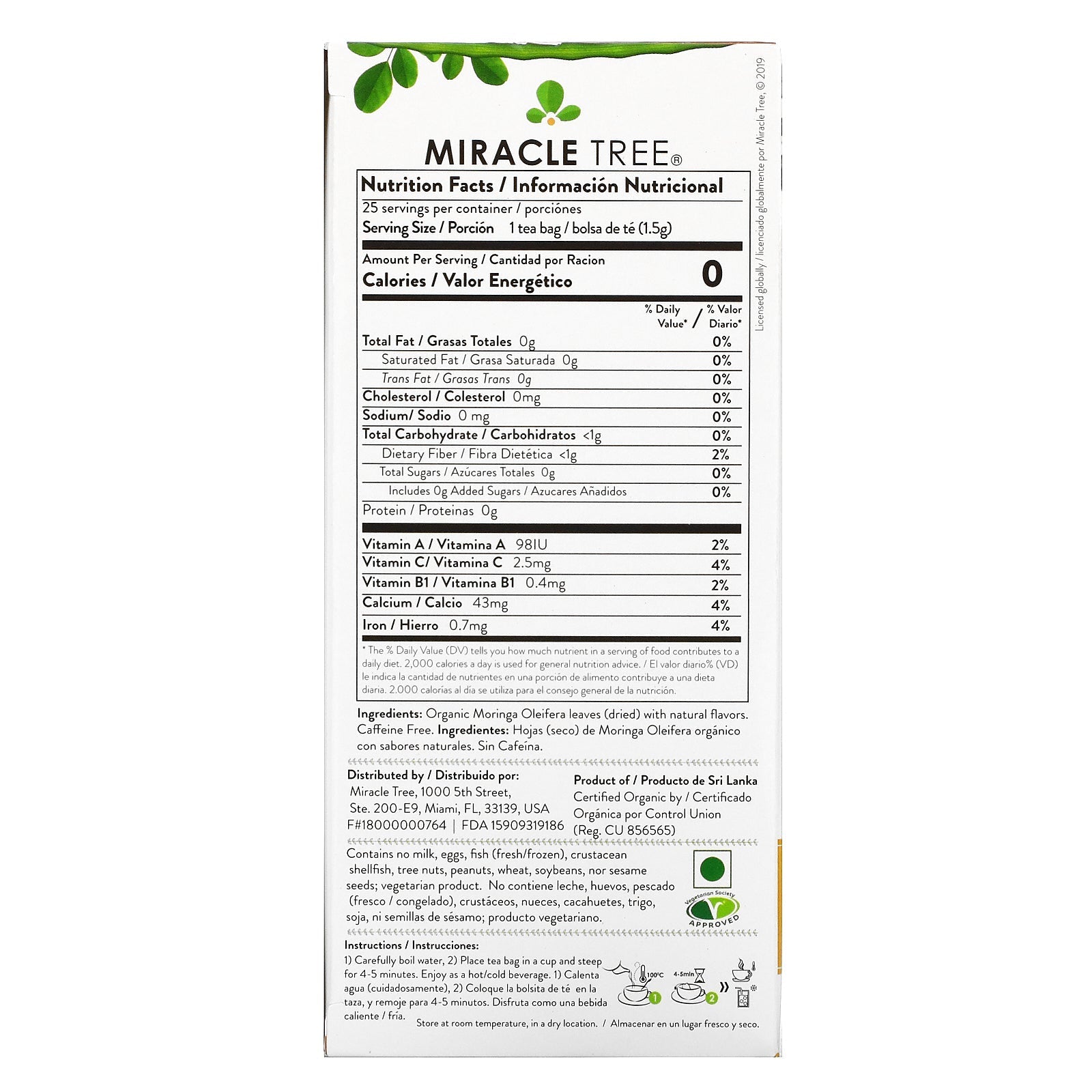 Contains Antioxidant & Amino-Acids USDA Caffeine Free Bleach Free Certified by Control Union Vegetarian Society Approved Gluten Free No GMOs Why you should choose our teas? Miracle Tree is an award-winning, family owned superfood brand. We first started with a focus on Moringa - one of the world's most nutrient-dense superfoods! Moringa has been used worldwide to combat malnutrition. It is a nutritionally complex whole food naturally rich in vitamins, minerals, antioxidants, & amino acids. Our moringa is and grown on single-source plantations (family-owned) in Sri Lanka. Our moringa is made with a love for delicious and award-winning tea! Our moringa is crafted with conscience for our environment and our local communities! Our moringa is selected with purpose, with special focus on great ingredients.Sugg. UseCarefully boil water Place tea bag in a cup and steep for 4-5 minutes. Enjoy as a hot/cold beverage.Other Ingredients moringa oleifera leaves (dried) with natural...