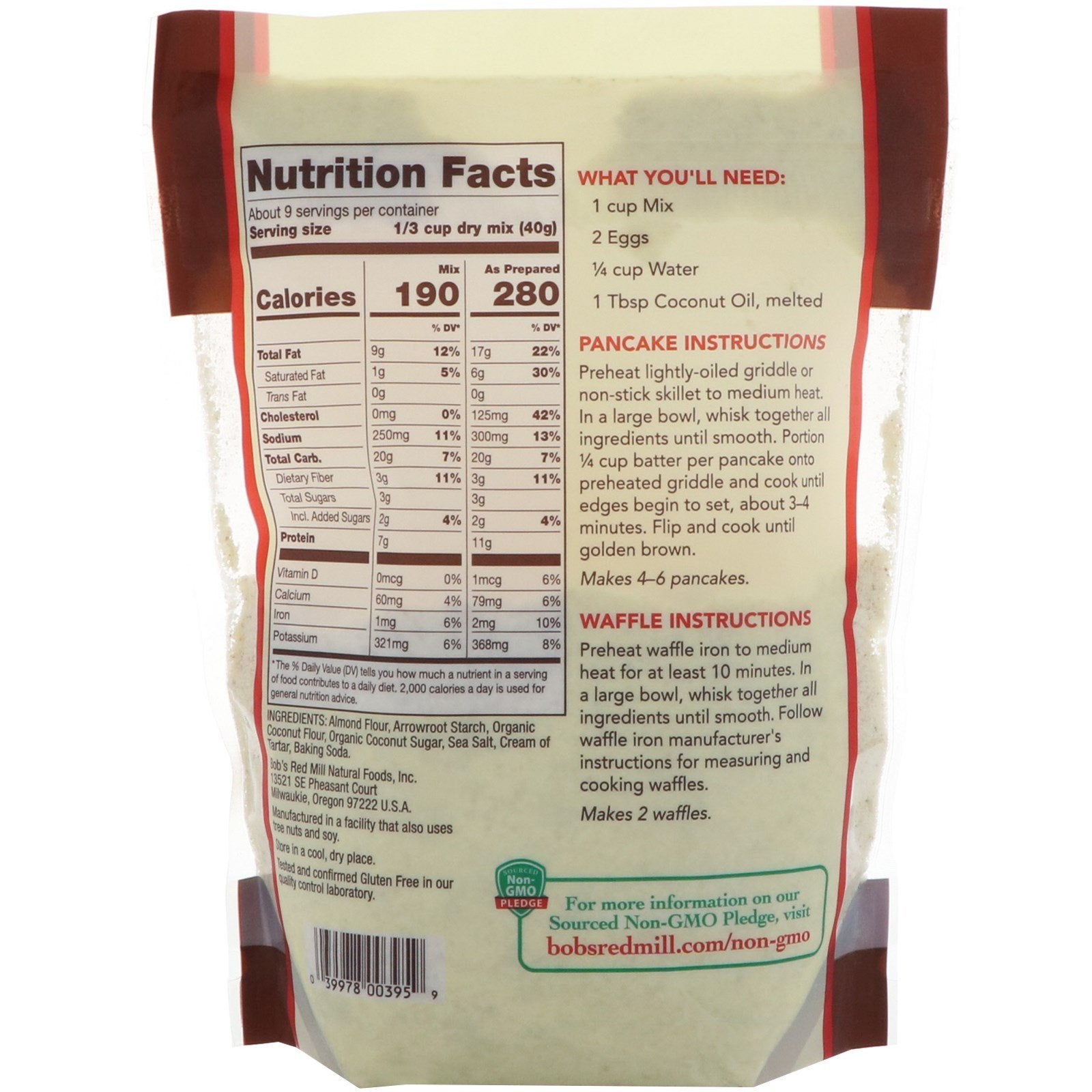 What You'll Need: 1 cup Mix 2 Eggs 1/4 cup Water 1 Tbsp Coconut Oil, melted Pancake Instructions Preheat lightly-oiled griddle or non-stick skillet to medium heat. In a large bowl, whisk together all ingredients until smooth. Portion 1/4 cup batter per pancake onto preheated griddle and cook until edges begin to set, about 3-4 minutes. Flip and cook until golden brown. Makes 4-6 pancakes. Waffle Instructions Preheat waffle iron to medium heat for at least 10 minutes. In a large bowl, whisk together all ingredients until smooth. Follow waffle iron manufacturer's instructions for measuring and cooking waffles. Makes 2 waffles.Other Ingredients