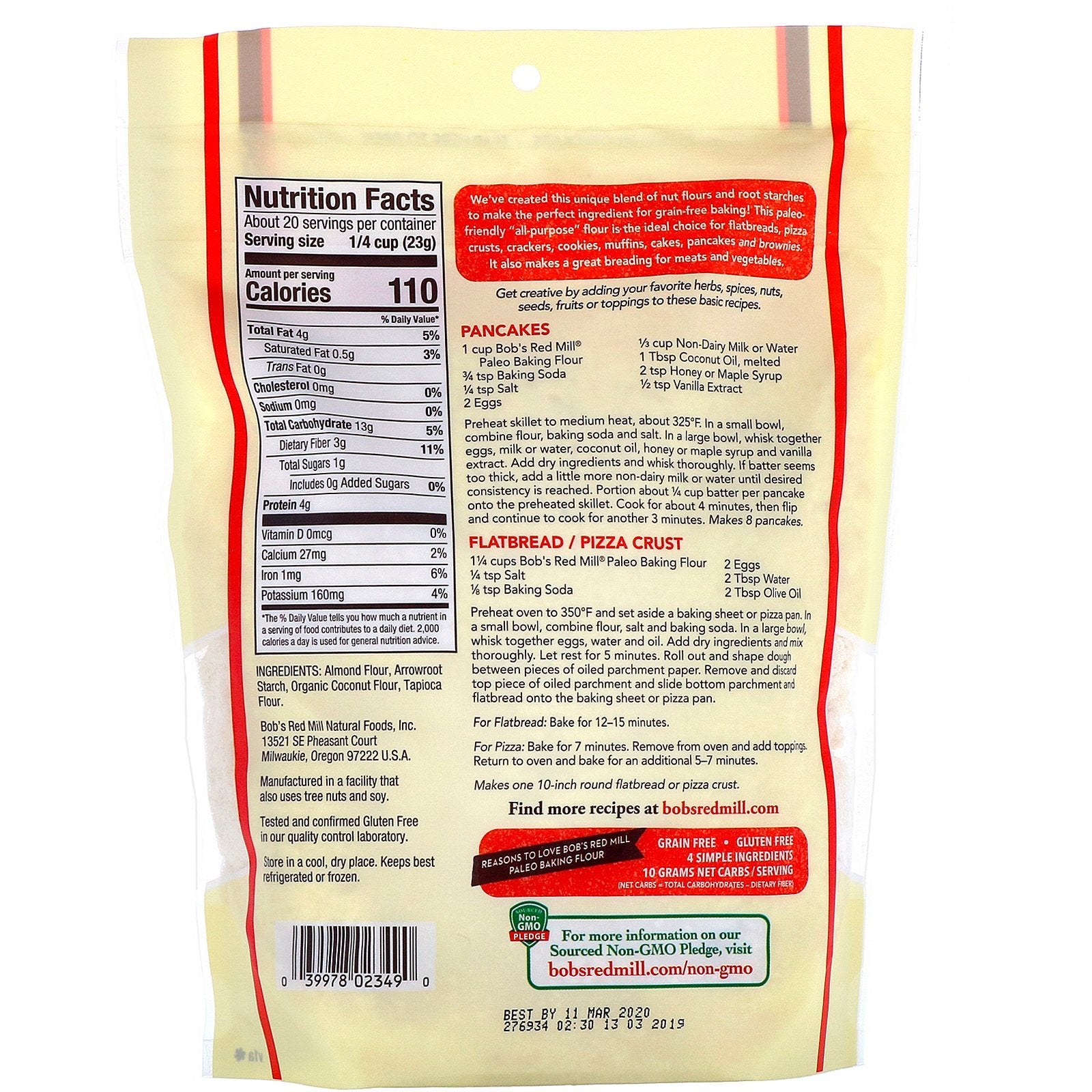 Resealable Package An Employee-Owned Company To Your Good Health -Bob Moore Sourced Non-GMO Pledge Kosher Pareve We've created this unique blend of nut flours and root starches to make the perfect ingredient for grain-free baking! This paleo-friendly "all-purpose" flour is the ideal choice for flatbreads, pizza crust, crackers, cookies, muffins, cakes, pancakes and brownies. It also makes a great breading for meats and vegetables. Reasons to Love Bob's Red Mill Paleo Baking Flour Grain Free Gluten Free 4 Simple Ingredients 10 Grams Net Carbs/Serving (Net carbs = total carbohydrate - dietary fiber)Sugg. UseMuffins + Cookies Cakes + Flatbread + Crackers Quick Bread + Pancakes + Pizza CrustOther IngredientsAlmond flour, arrowroot starch, organic coconut flour, tapioca flour. Manufactured in a facility that also uses tree nuts and soy. Tested and confirmed Gluten Free in our quality control laboratory.Supplement FactsServing Size: 1/4 cup (23 g) Serving Per Container: About 20 Amount Per...