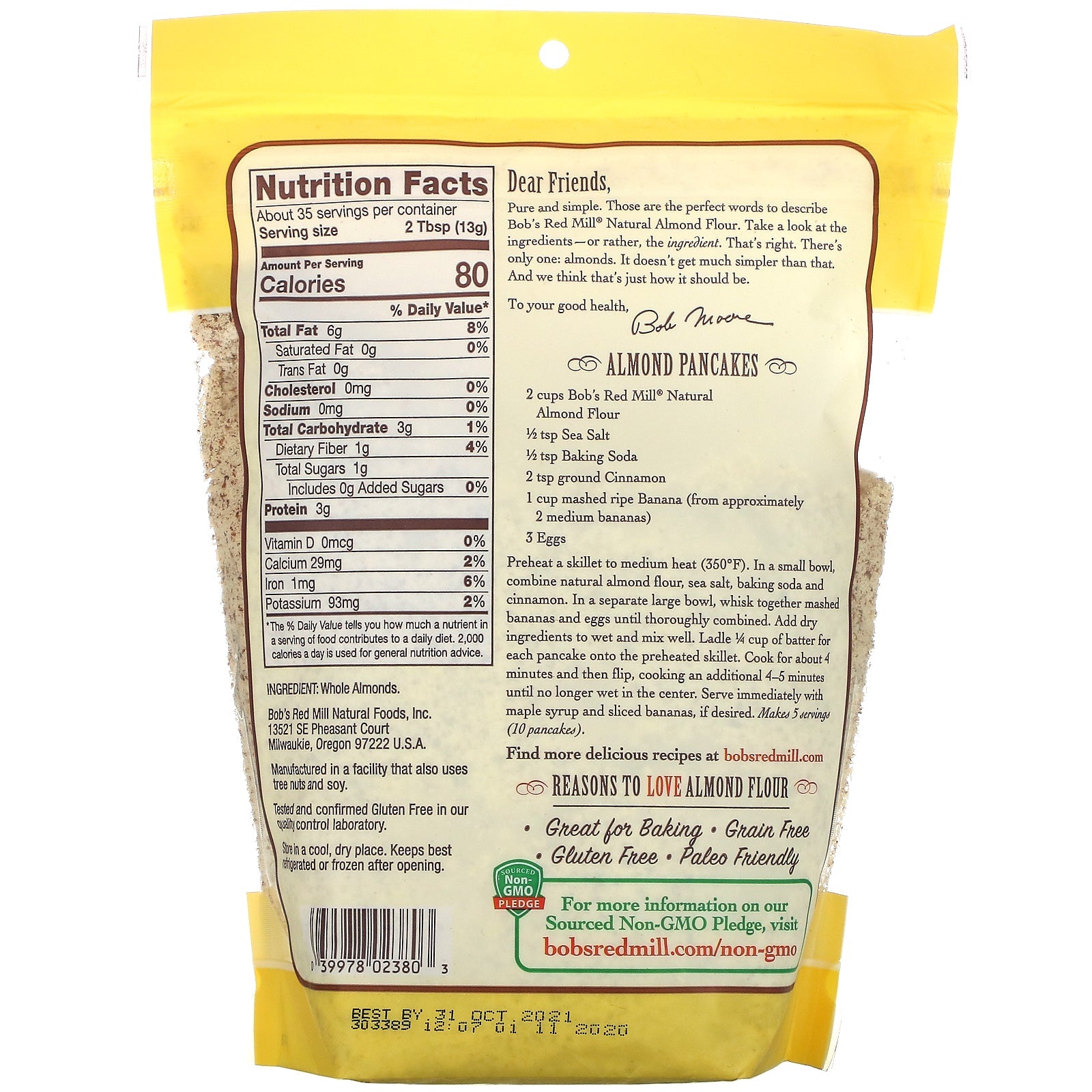 An Employee-Owned Company To Your Good Health ® From Whole Almonds Sourced Non-GMO Pledge Kosher Pareve You Can See Our Quality ® Our natural almond flour is ground from whole almonds with the skin intact. It is gluten free and contains 3 grams of carbohydrates per serving. Use it in grain free and gluten free baking, or try it as a breading for meats and vegetables. It lends a moist texture and rich, buttery flavor to cakes, cookies, pancakes, and muffins. Dear Friends, Pure and simple. Those are perfect words to describe Bob's Red Mill ® Natural Almond Flour. Take a look at the ingredients-or rather, the ingredient. That's right. There's only one: almonds. It doesn't get much simpler than that/ And we think that's just how it should be. To your good health, Bob Moore Reasons to Love Almond Flour: Great for Baking Grain Free Gluten Free Paleo Friendly