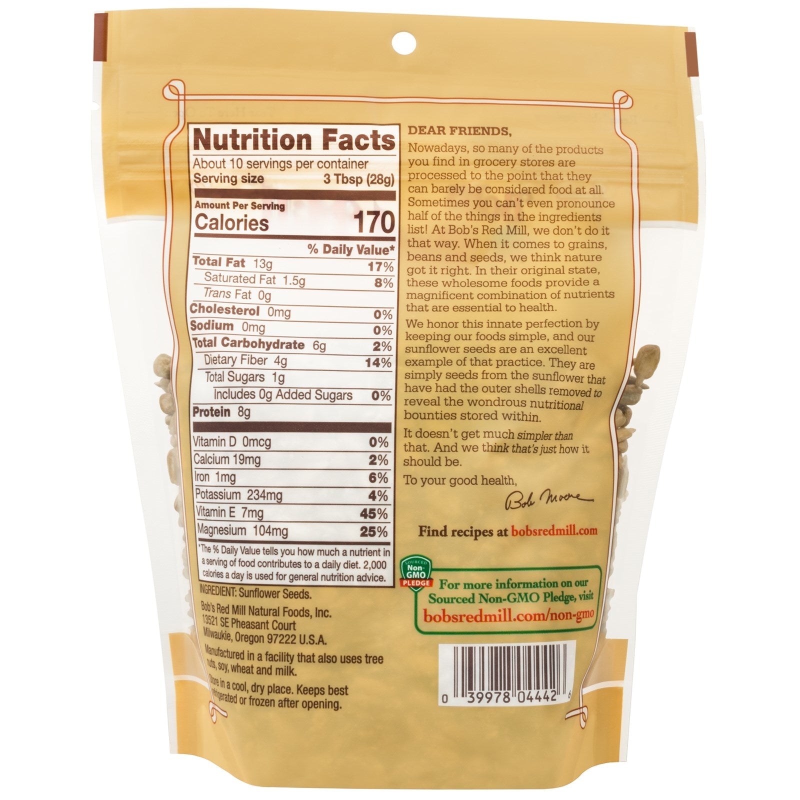 An Employee-Owned Company Premium You Can See Our Quality Sourced Non-GMO Pledge Kosher Pareve Dear Friends, nowadays, so many of the products you find in grocery stores are processed to the point that they can barely be considered food at all. Sometimes you can't even pronounce half of the things in the ingredients list! At Bob's Red Mill, we don't do it that way. When it comes to grains, beans and seeds, we think nature got it right. In their original state, theses wholesome foods provide a magnificent combination of nutrients that essential to health. We honor this innate perfection by keeping our foods is simple, and our sunflower seeds are an excellent example of that practice. They are simply seeds from the sunflower that have had the outer shells removed to reveal the wondrous nutritional bounties stored within them. It doesn't get much simpler than that. And we think that's just how it should be. To your good health. - Bob Moore.