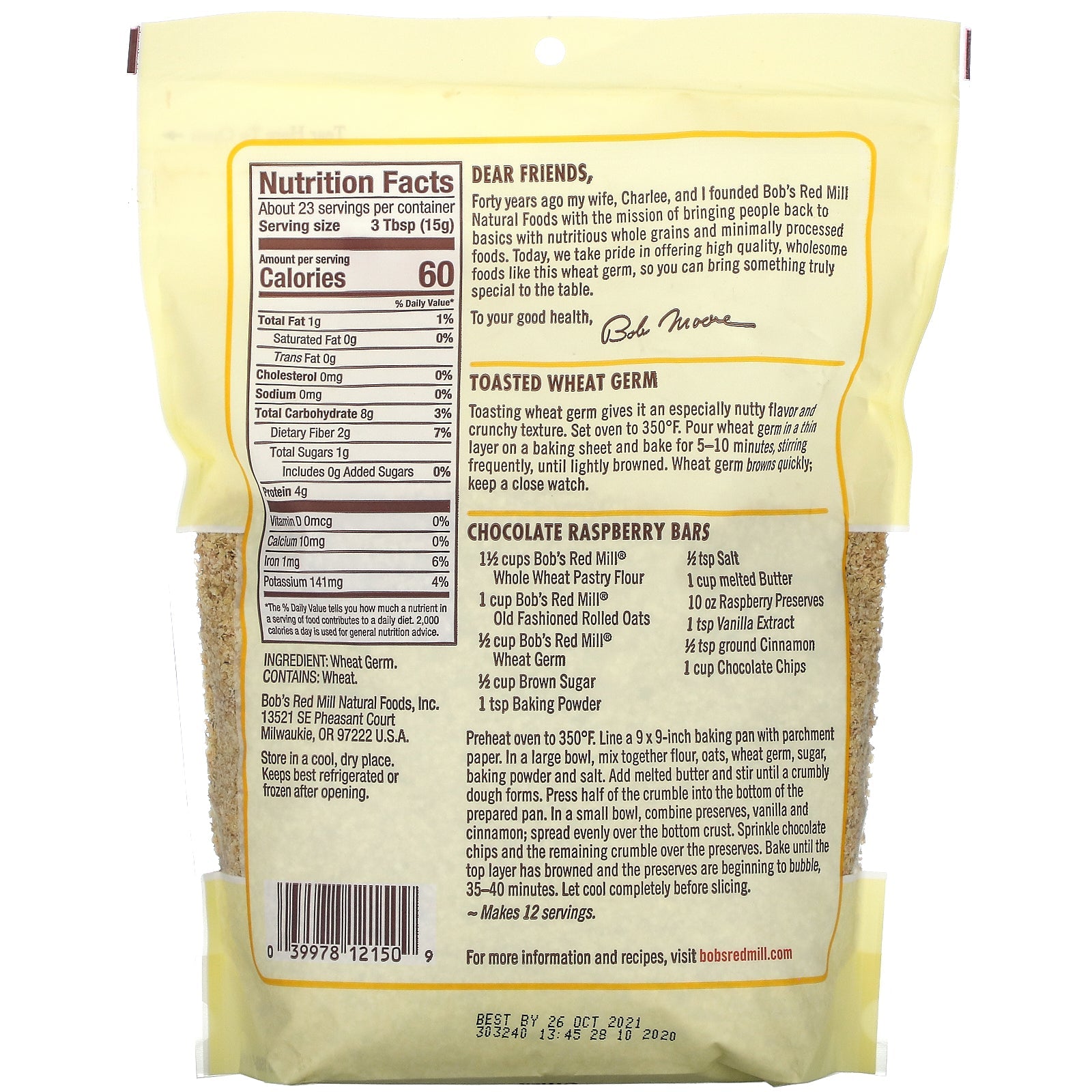 An Employee-Owned Company To Your Good Health ® Premium Quality Non GMO Project Verified Kosher Pareve You Can See Our Quality ® The Heart of the Wheat Kernel Wheat germ is the heart of the wheat kernel and has a delicious, nutty flavor. Use wheat germ in baked goods like cookies, muffins and bread, as breeding for chicken and fish, and in meatballs and meatloaf. Dear Friends, Forty years ago my wife, Charlee, and I founded Bob's Red Mill Natural Foods with the mission of bringing people back to basics with nutritious whole grains and minimally processed foods. Today, we take pride in offering high quality, wholesome foods like this wheat germ, so you can bring something truly special to the table. To your good health, Bob MooreSugg. UseKeeps best refrigerated or frozen after opening.Other IngredientsWheat germ. Contains : WheatSupplement FactsServing Size: 3 Tbsp (15 g) Serving Per Container: About...