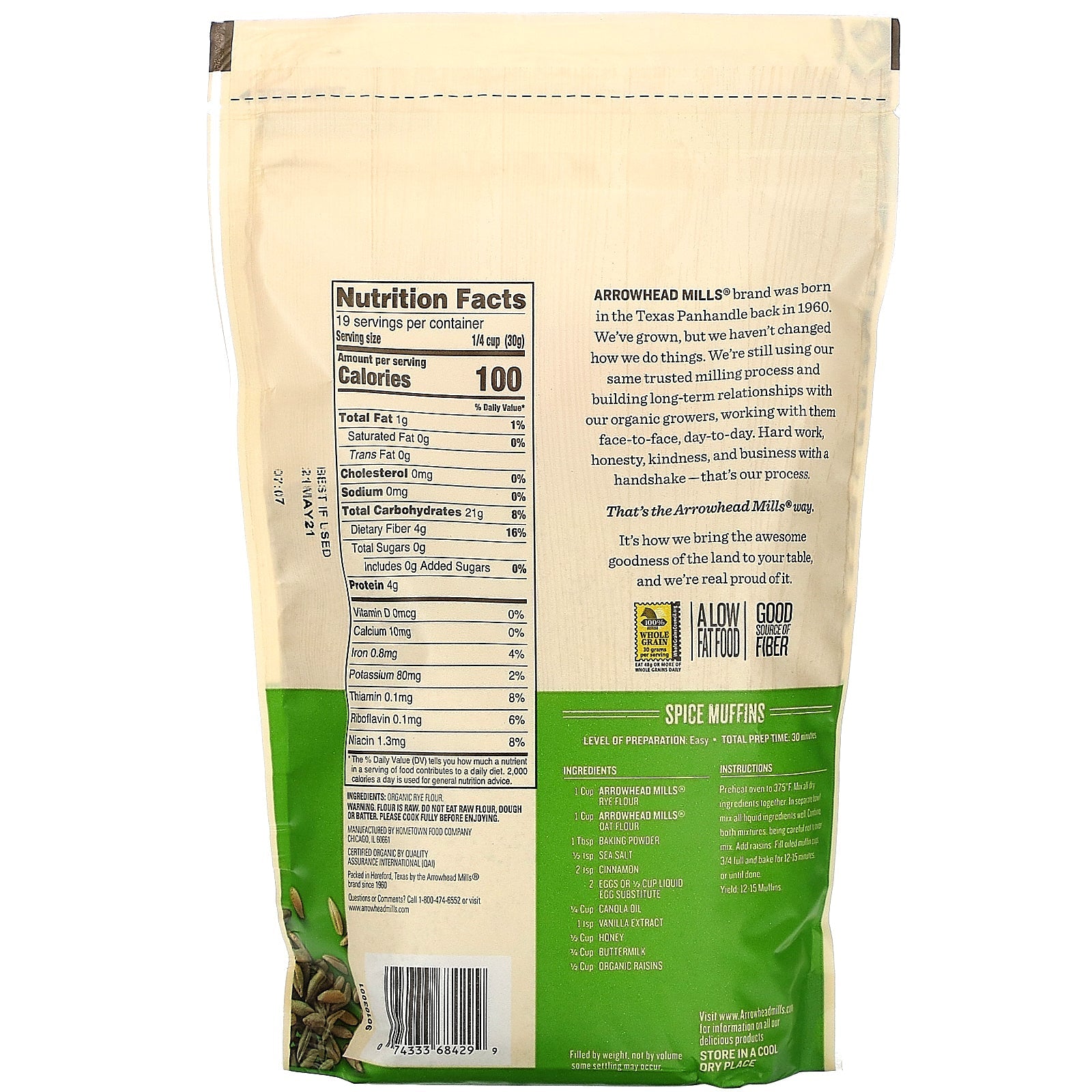 USDA Non GMO Project Verified Kosher Parve 100% Whole Grain - 36 g Per Serving Eat 48 g or More of Whole Grains Daily A Low Fat Food Good Source of Fiber Certified by Quality Assurance International (QAI) It's simple: No short-cuts, just 100% commitment to quality and 30 g whole grains per serving. Arrowhead Mills® brand was born in the Texas Panhandle back in 1960. We've grown, but we haven't changed how we do things. We're still using our same trusted milling process and building long-term relationships with our growers, working with them face-to-face, day-to-day. Hard work, honesty, kindness, and business with a handshake - that's our process. That's the Arrowhead Mills® way. It's how we bring the awesome goodness of the land to your table, and we're real proud of it.Sugg. UseOther Ingredients rye flour.Supplement FactsServing Size: 1/4 cup (30 g) Servings Per Container: about 19 Amount Per...