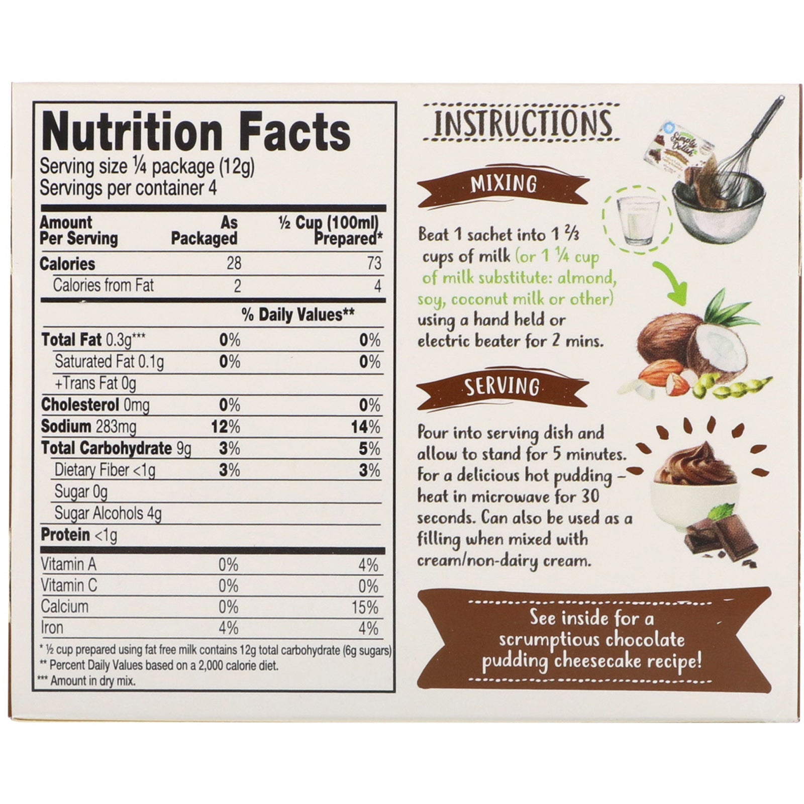 Sugar Free 28 Calories Per Serving Only 4g Net Carbs Per Serving Kosher Parve Non-GMO Project Verified Vegan Friendly Non GMO Low Carb Lactose Free Nut Free Gluten Free Halal Simply delicious desserts can be Vegan, Lactose and Dairy free when made with Soy, Almond, Rice or Coconut Milk.Sugg. UseMixing: Beat 1 sachet into 1 2/3 cups of milk (or 1 1/4 cup of milk substitute: almond, soy, coconut milk or other) using a hand held or electric beater for 2 min. Serving: Pour into serving dish and allow to stand for 5 minutes. For a delicious hot pudding - heat in microwave for 30 seconds. Can also be used as a filling when mixed with cream/non-dairy cream.Other IngredientsStarch (potato), erythritol, cocoa, emulsifiers, stevia extract, salt, natural flavor (vanilla). Allergen: Soy lecithin Free from: Peanut, tree nuts, sesame, wheat, dairy, egg and fish.Supplement FactsServing Size: 1/4 package (12 g) Serving...