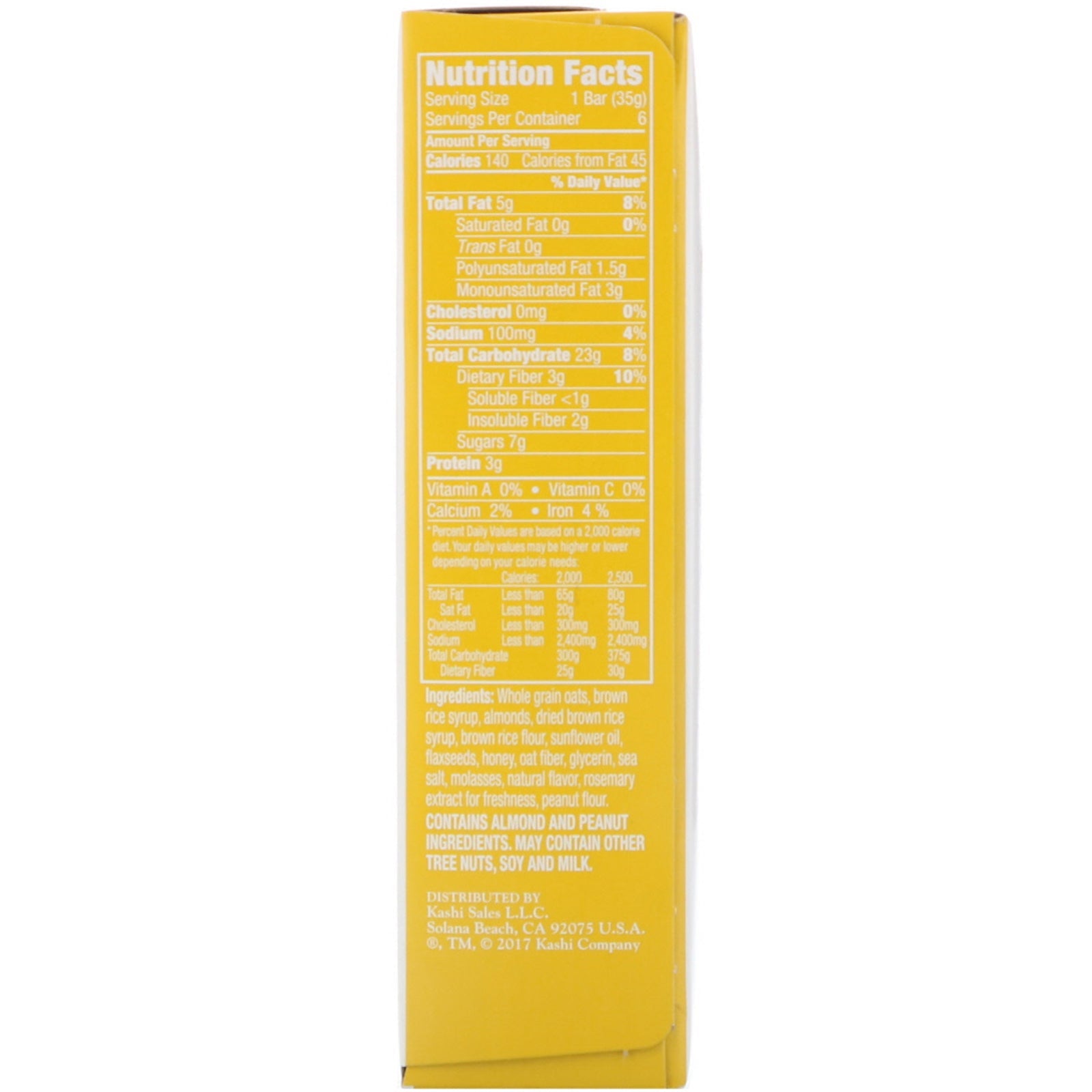 Serving Size: 1 Bar (35 g) Serving Per Container: 6 Amount Per Serving %Daily Value* Calories 140 Calories from Fat 45 Total Fat 5 g 8% Saturated Fat 0 g 0% Trans Fat 0 g Polyunsaturated Fat 1.5 g Monounsaturated Fat 3 g Cholesterol 0 mg 0% Sodium 100 mg 4% Total Carbohydrate 23 g 8% Dietary Fiber 3 g 10% Soluble Fiber < 1 g Insoluble Fiber 2 g Sugars 7 g Protein 3 g Vitamin A 0% Vitamin C 0% Calcium 2% Iron 4% *Percent Daily Values are based on a 2,000 calorie diet. Your daily values may be higher or lower depending on your calorie needs: