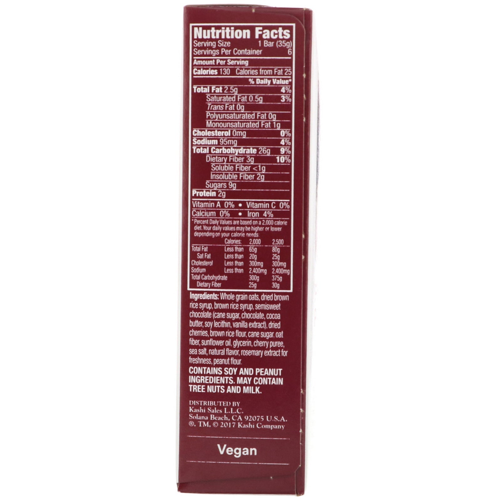 Non GMO Project Verified Sweet & Tart Cherries Responsibly Sourced Cocoa 3 g Fiber Kosher Vegan Food with Purpose We all want to seek out tasty food that not only nourishes our body, but also positively impacts the land and community it came from. So, our Kashi team traveled to Ghana to do just that for chocolate, and what we found was that we could do better. We learned that we could pay a premium on our chocolate that would help our cocoa farmers implement responsible agriculture practices. This not only improves their livelihoods, but also keeps the soil healthy for future generations.Sugg. UseOther IngredientsWhole grain oats, dried brown rice syrup, brown rice syrup, semisweet chocolate (cane sugar, chocolate, cocoa butter, soy lecithin, vanilla extract), dried cherries, brown rice flour, cane sugar, oat fiber, sunflower oil, glycerin, cherry puree, sea salt, natural flavor, rosemary extract for freshness, peanut flour. Contains...