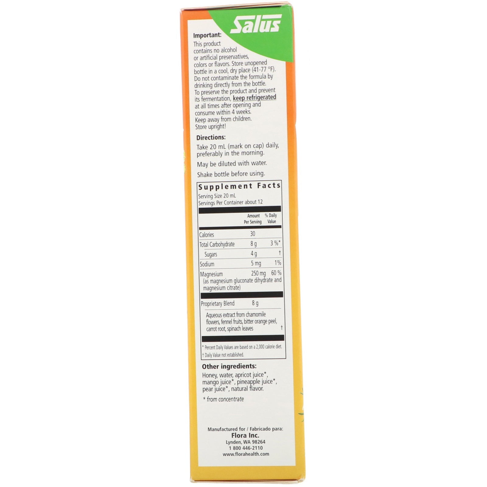 Vegetarian Formula No Artificial Preservatives, Colors or Flavors Kosher Parve Easily AbsorbedSugg. UseTake 20 ml (mark on cap) daily, preferably in the morning. May be diluted with water. Shake bottle before using. Important: Must be refrigerated after opening. Store upright!Other IngredientsHoney, water, apricot juice*, mango juice*, pineapple juice*, pear juice*, natural flavor. *From concentrate. This product contains no alcohol or artificial preservatives, colors or flavors.Supplement FactsServing Size: 20 ml Servings Per Container: about 12 Amount Per Serving % Daily Value Calories 30 Total Carbohydrate 8 g 3%* Sugars 4 g † Sodium 5 mg 1% Magnesium (as magnesium gluconate dihydrate and magnesium citrate) 250 mg 60% Proprietary Blend: Aqueous extract from chamomile flowers, fennel fruits, bitter orange peel, carrot root, spinach leaves. 8 g † * Percent Daily Values are based on a 2,000 calorie diet. † Daily Value not established.DisclaimerWhile VitaminsUK strives to ensure the accuracy of its product...